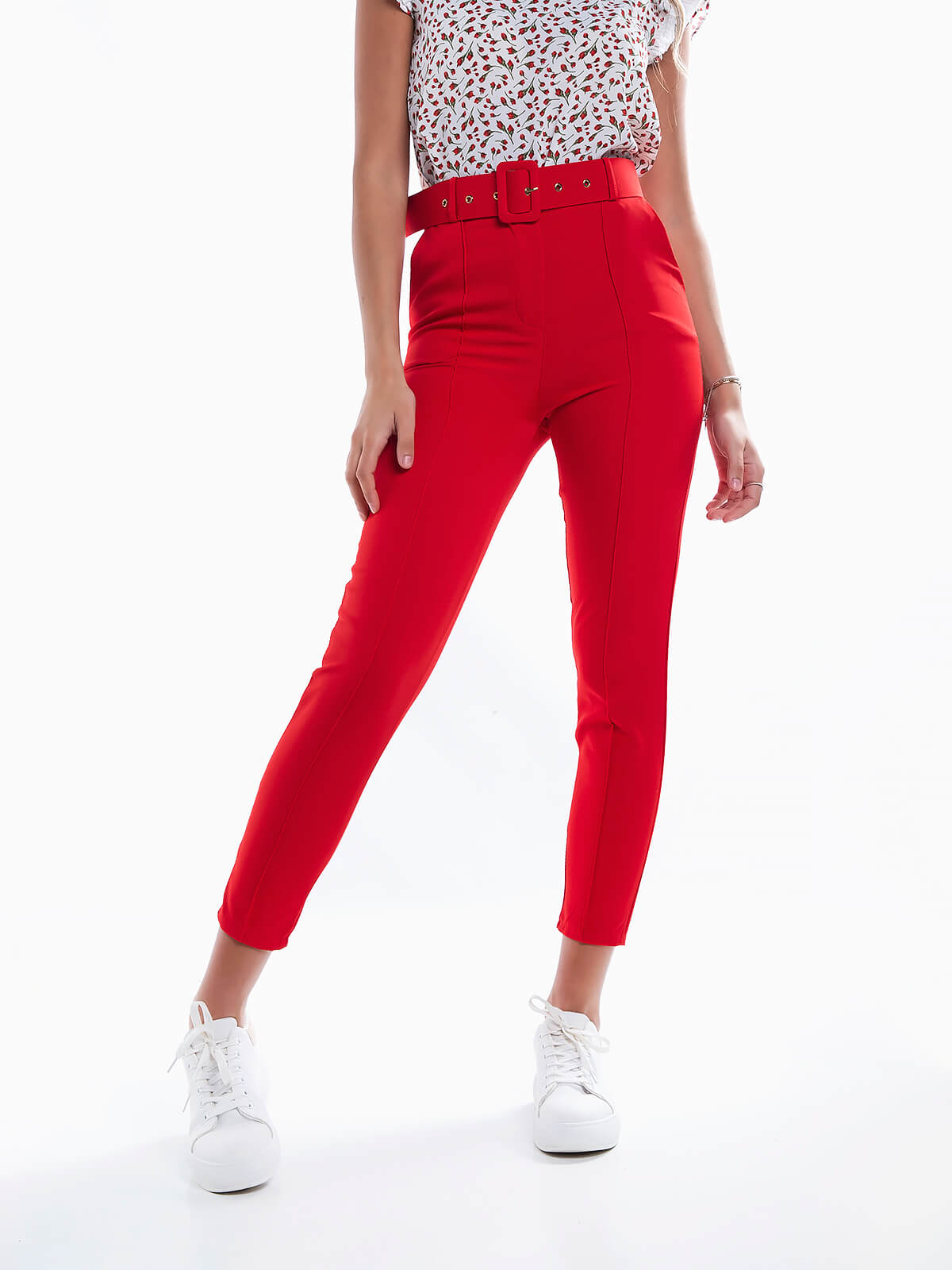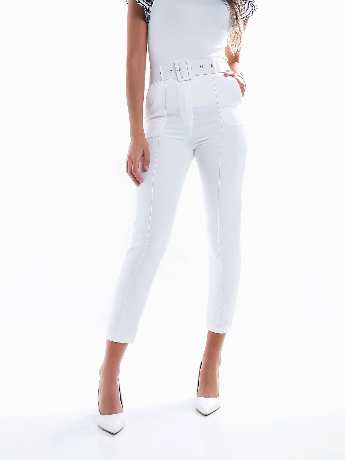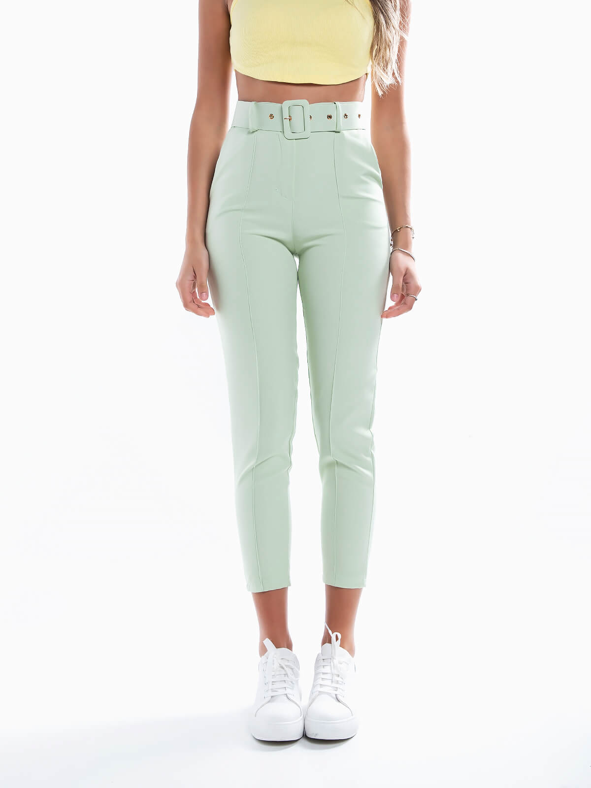 Calças de cintura alta com cinto para senhora. Calças com costura reforçada na frente. 2 bolsos faca laterais. Aperto de fecho éclair e 1 botão.