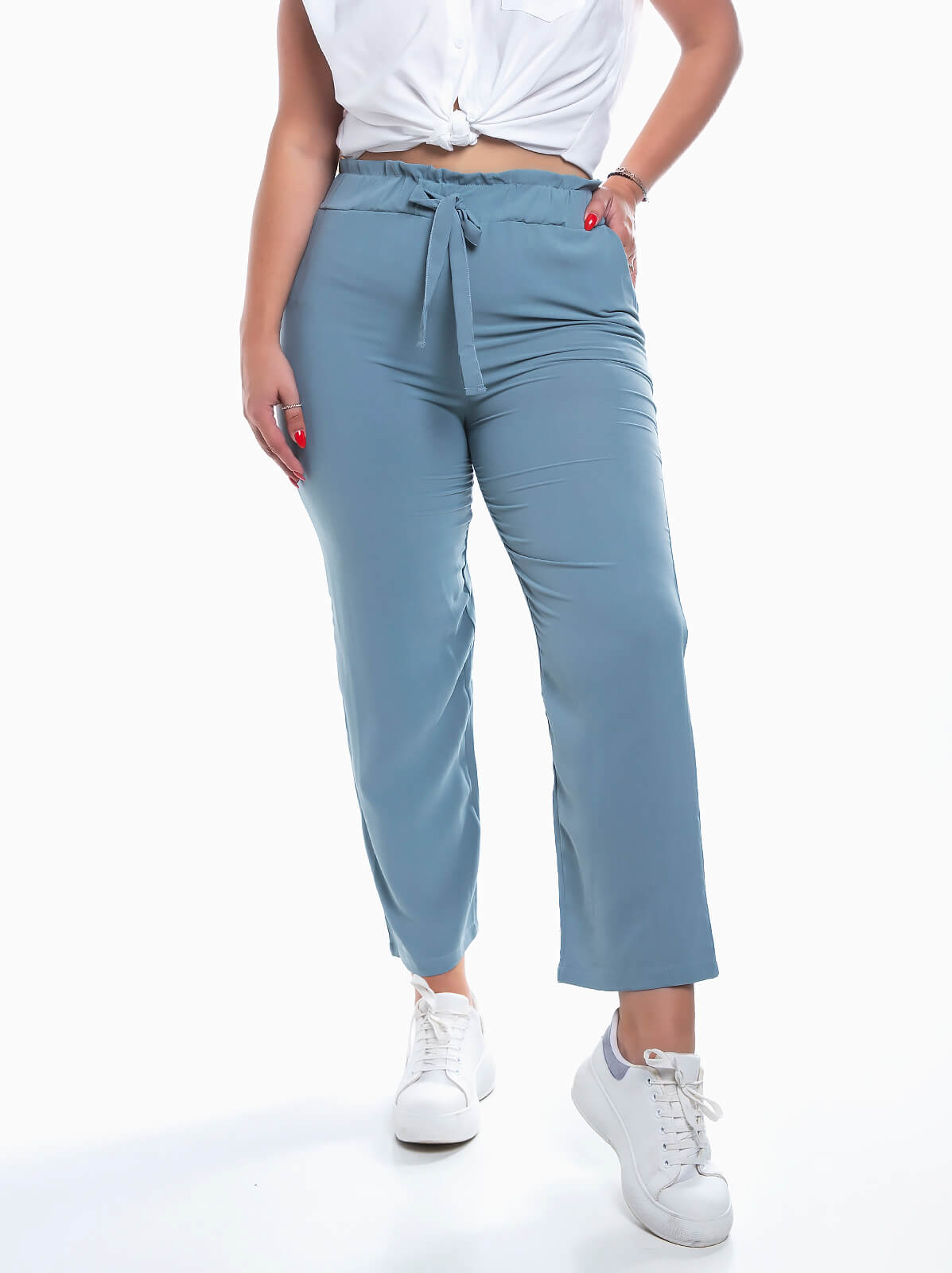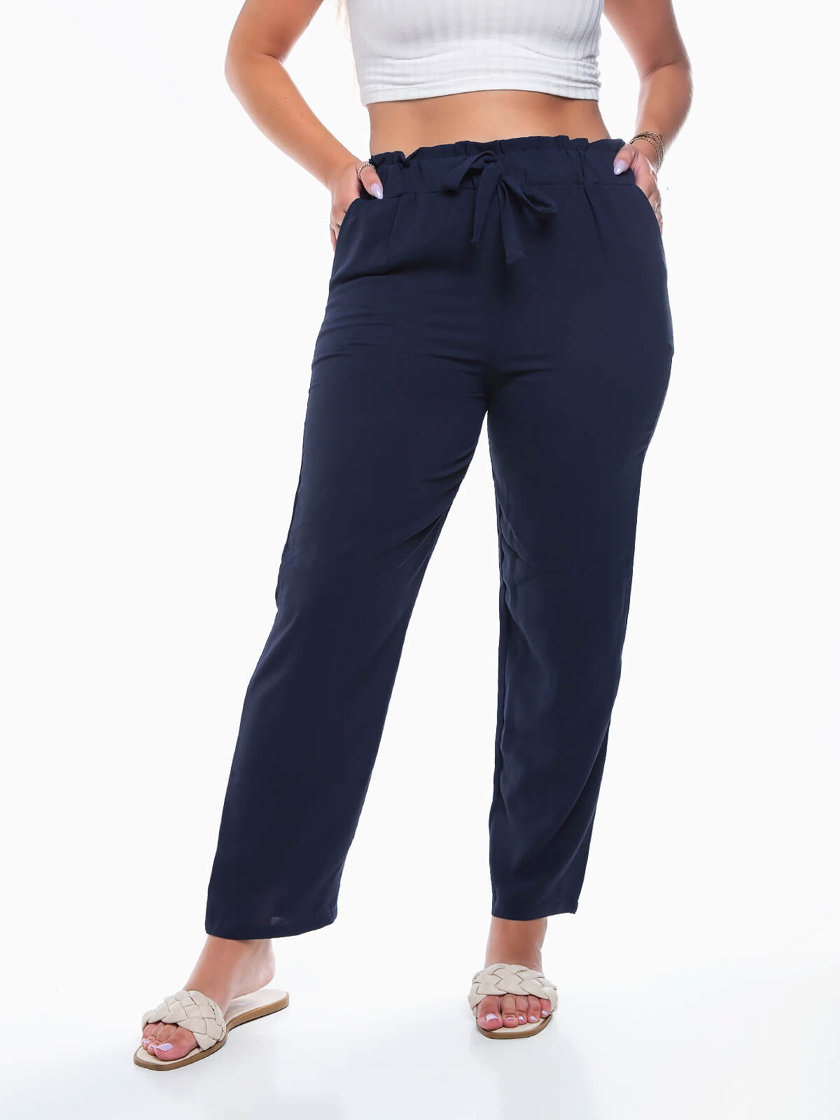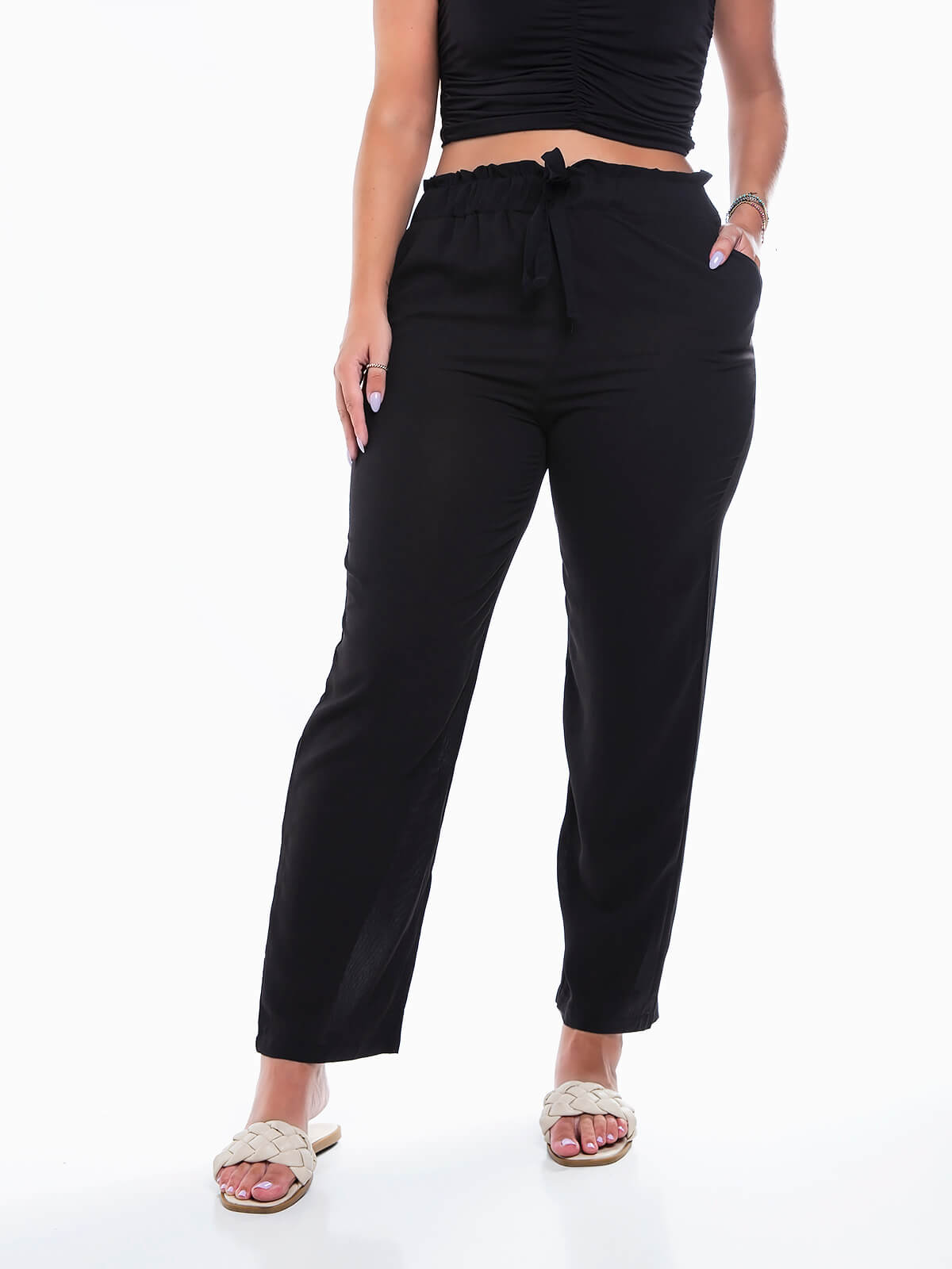 Calças de cintura alta elástica paperbag com laço aplicado. Perna reta. 2 bolsos laterais.