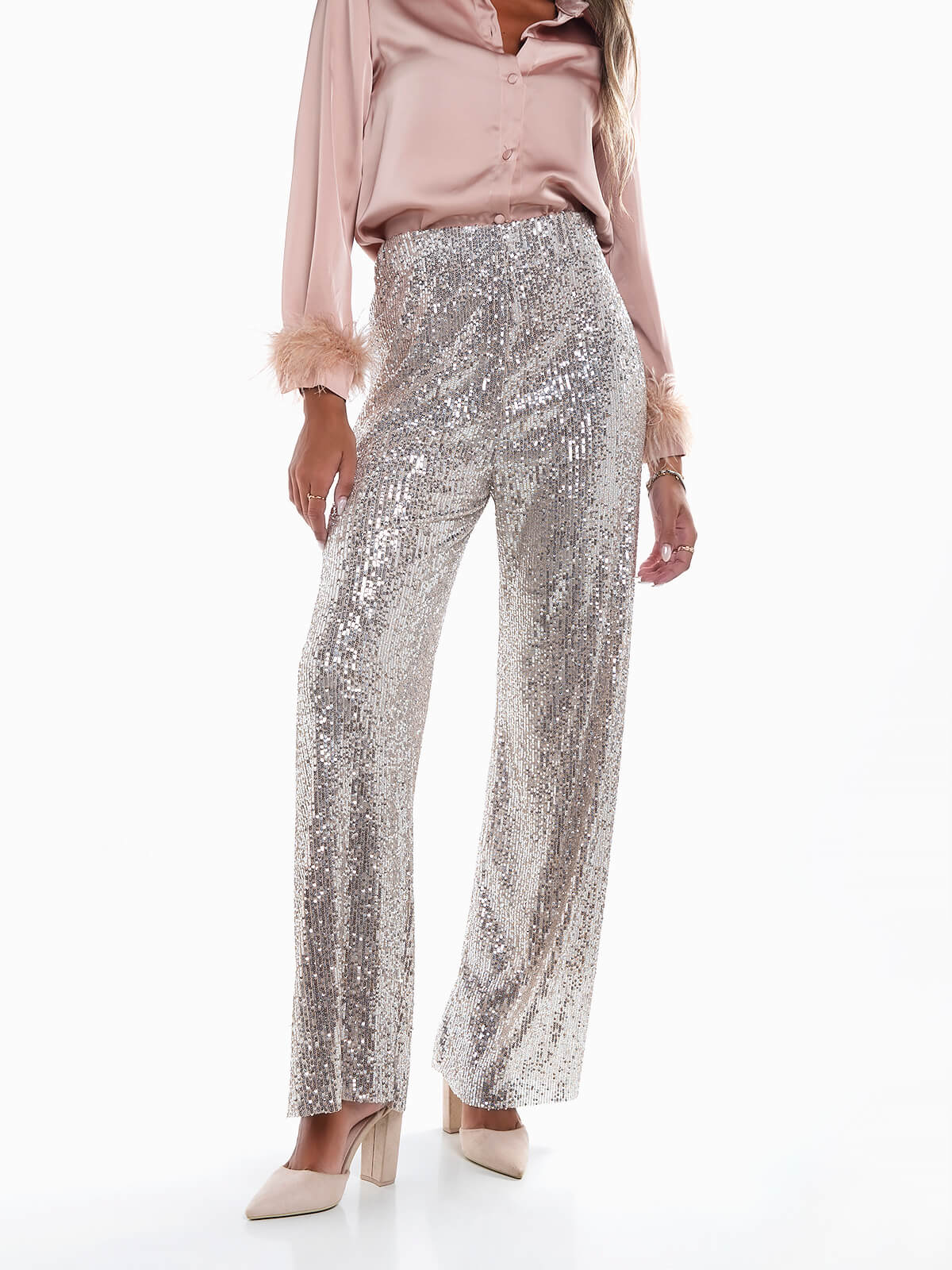 Calças cintura alta elástica com lantejoulas para efeito brilhante. Calças de perna reta com interior forrado.