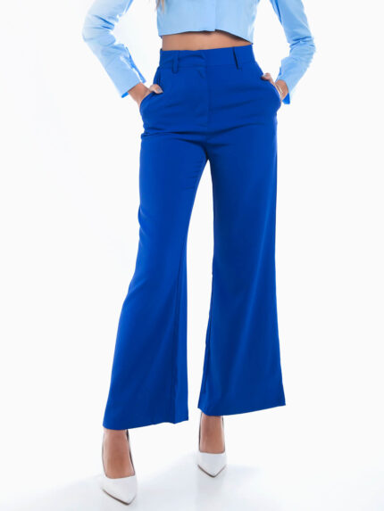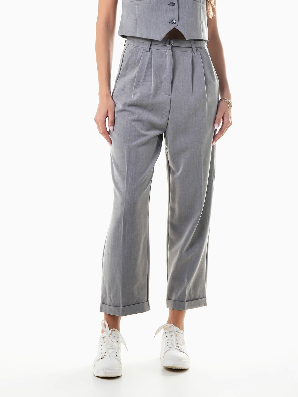 Calças de cintura alta com pormenor de pinças. Calças de alfaiataria com cinto no mesmo tecido para ajustar. 2 bolsos. Dobra na base. Aperto de colchete, botão e fecho zíper.