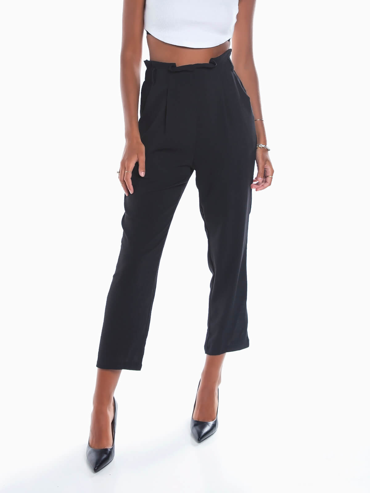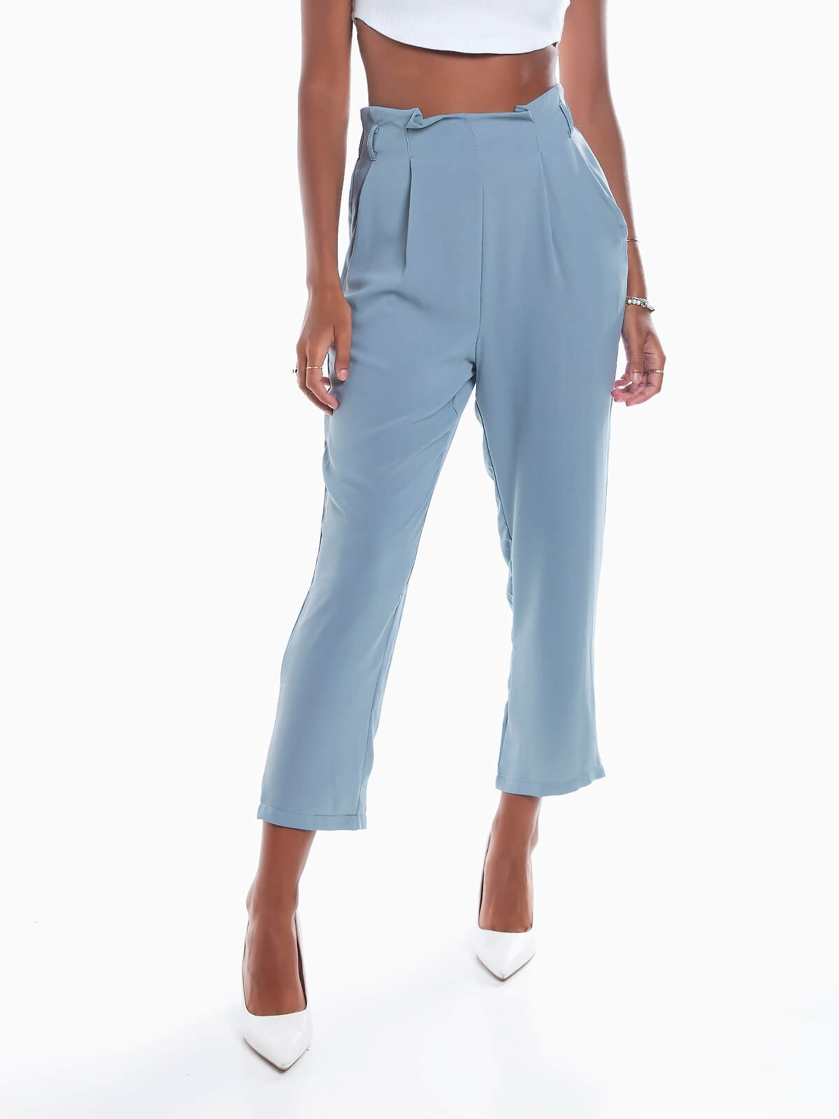 Calças de cintura alta elástica com pregas para senhora. Calças fluídas com 2 bolsos dos lados. Perna larga.