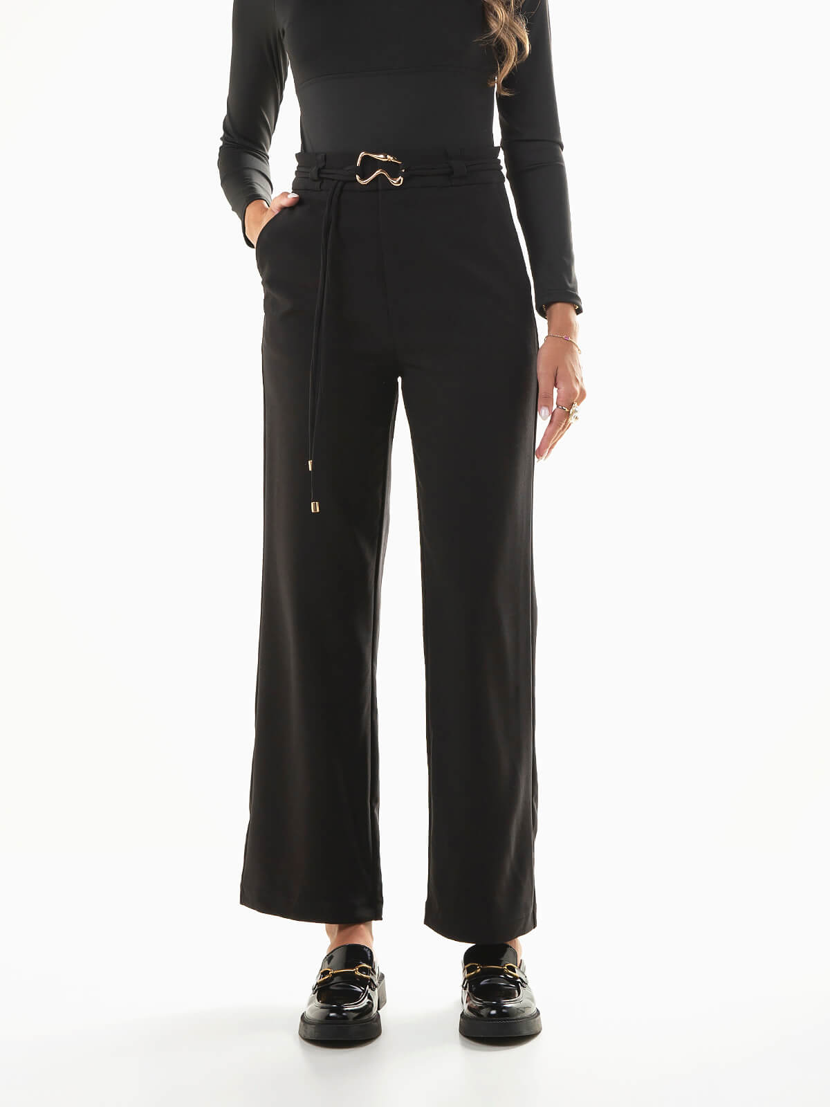 Calças em tecido consistente com alguma elasticidade, cintura alta e corte reto. Aperto com fecho zíper, botão e colchetes, com cinto em cordão e aplique dourado. Dois bolsos para um look elegante e versátil, perfeito para combinações formais ou casuais sofisticadas.