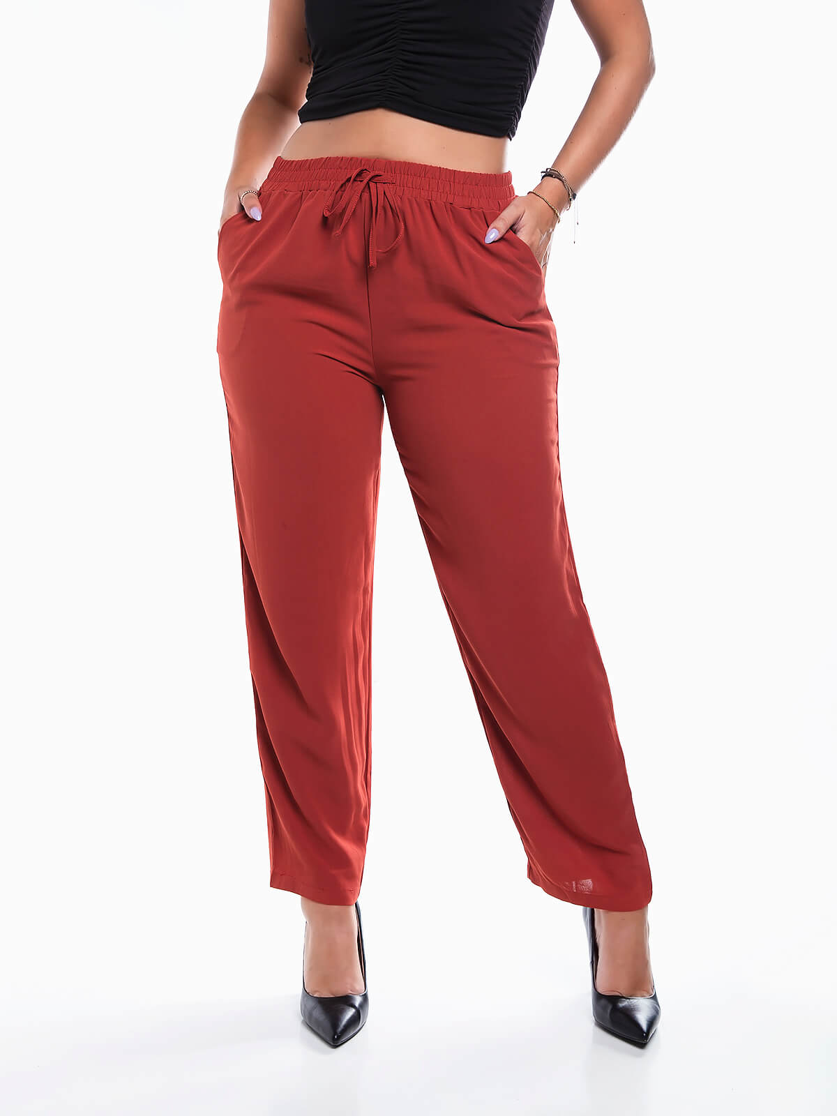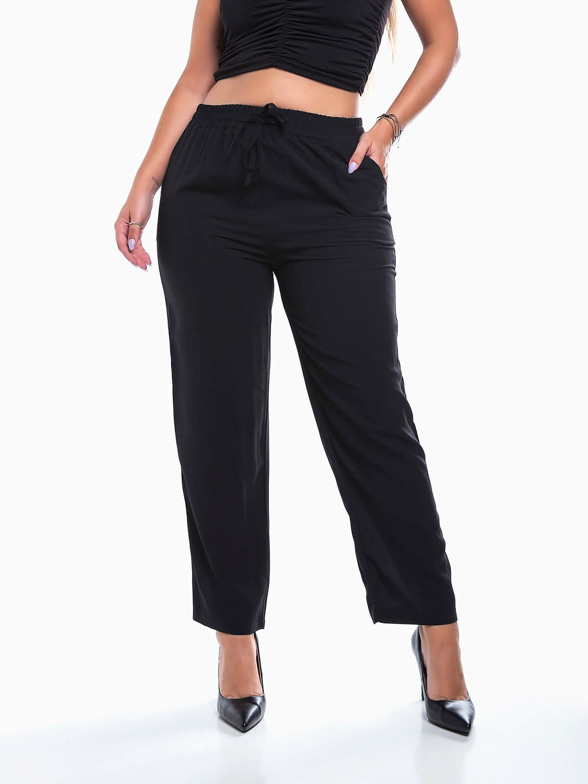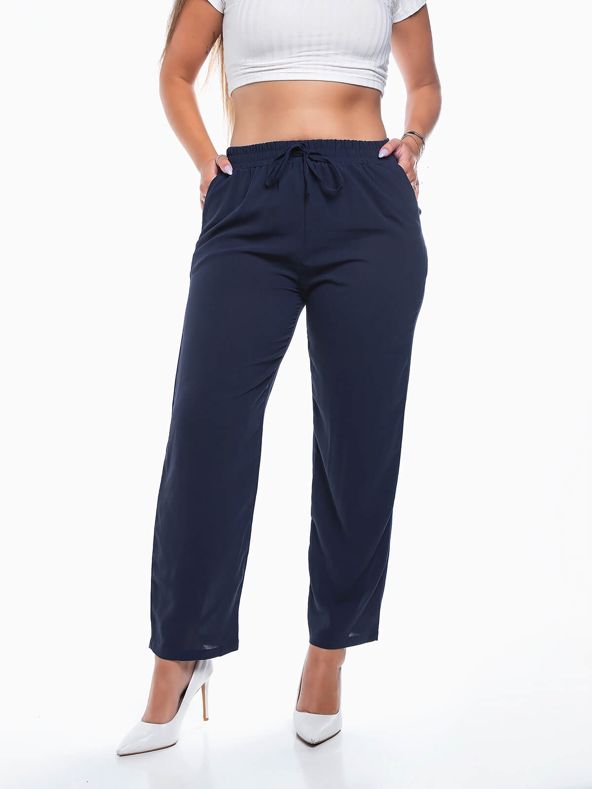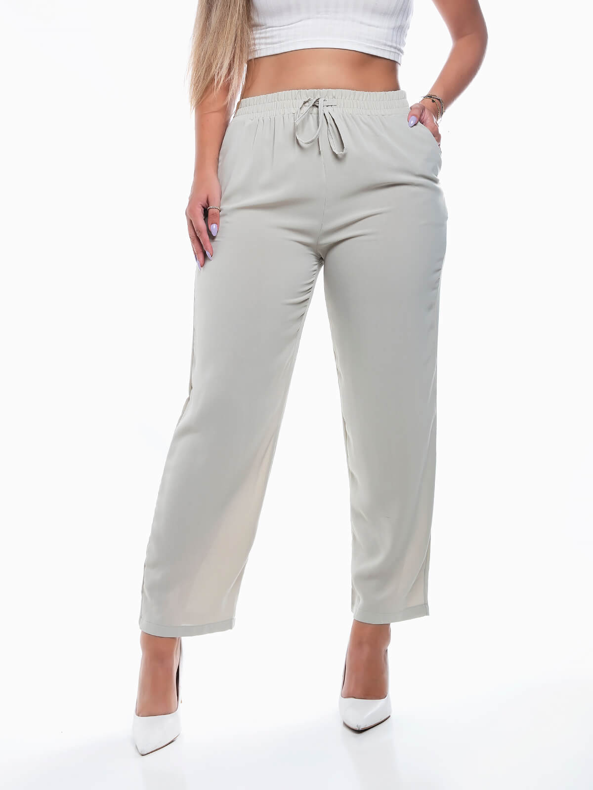 Calças de cintura alta elástica com cordão para efeito. Calças em tecido leve e fresco com 2 bolsos laterais.