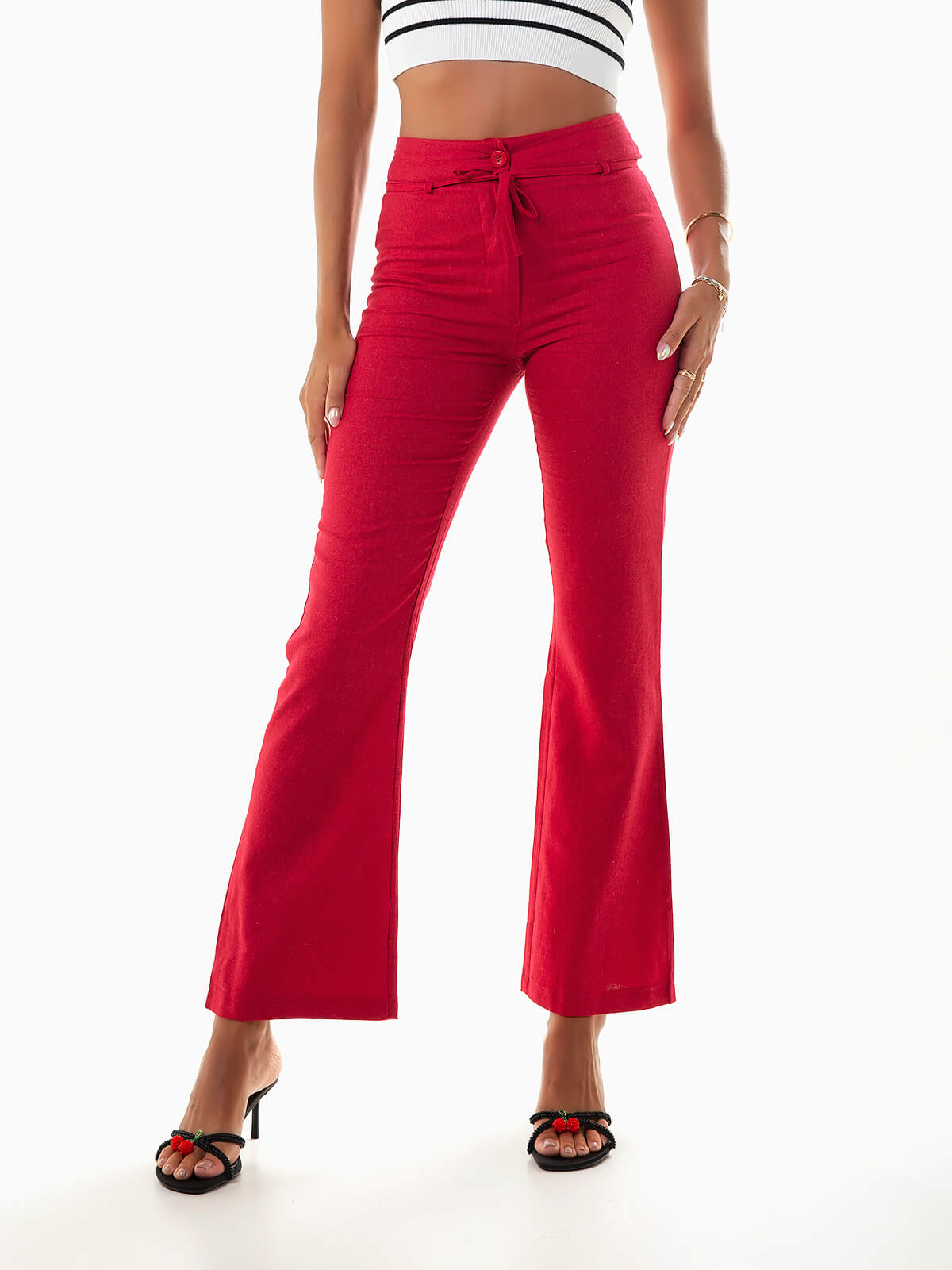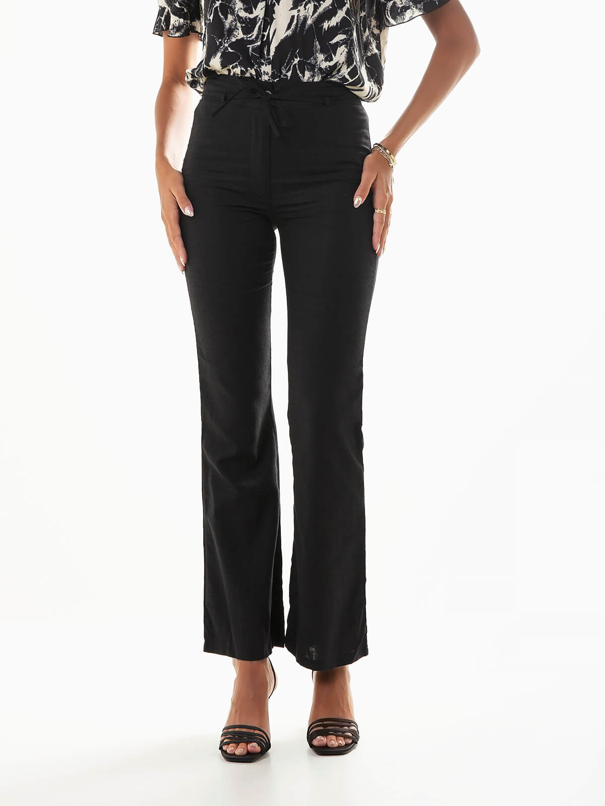 Calças de cintura alta confecionadas em tecido com mistura de linho para maior durabilidade e respirabilidade. Calças de corte reto com cordão para ajustar removível. Aperto de fecho éclair e botão.