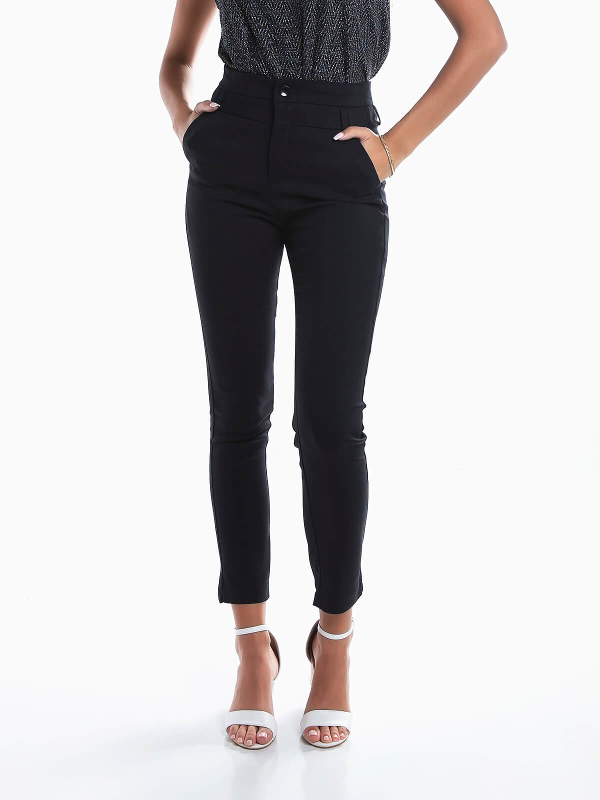 Calças de cintura alta pretas para senhora. Calças clássicas com dois bolsos cortados e dois decorativos na parte posterior.