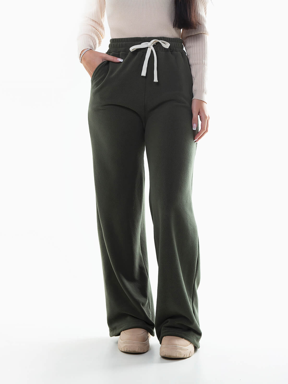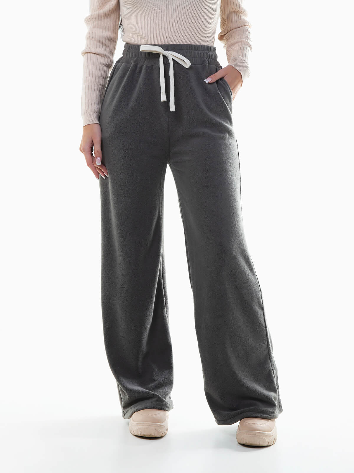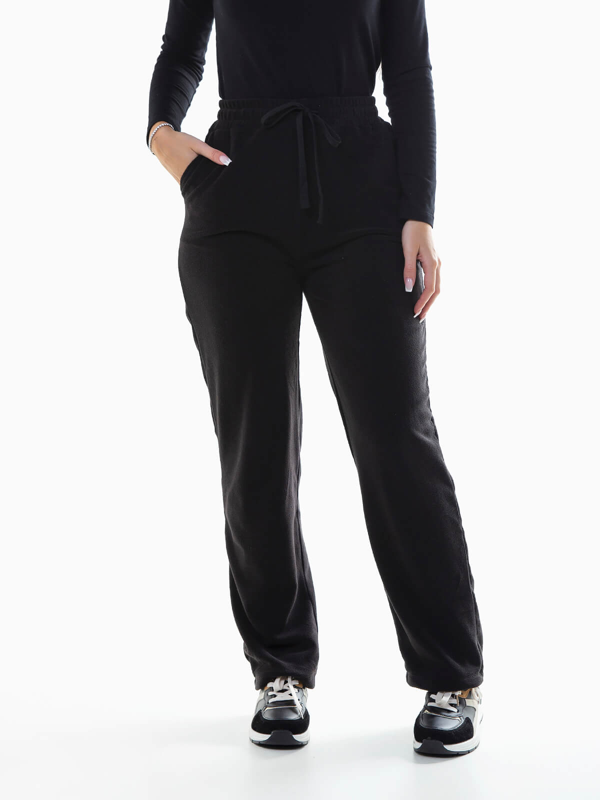 Calças de cintura alta elástica em tecido polar para senhora. Calças largas com cordão para ajustar. 2 bolsos.