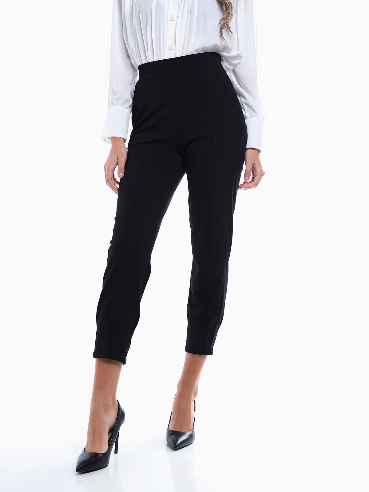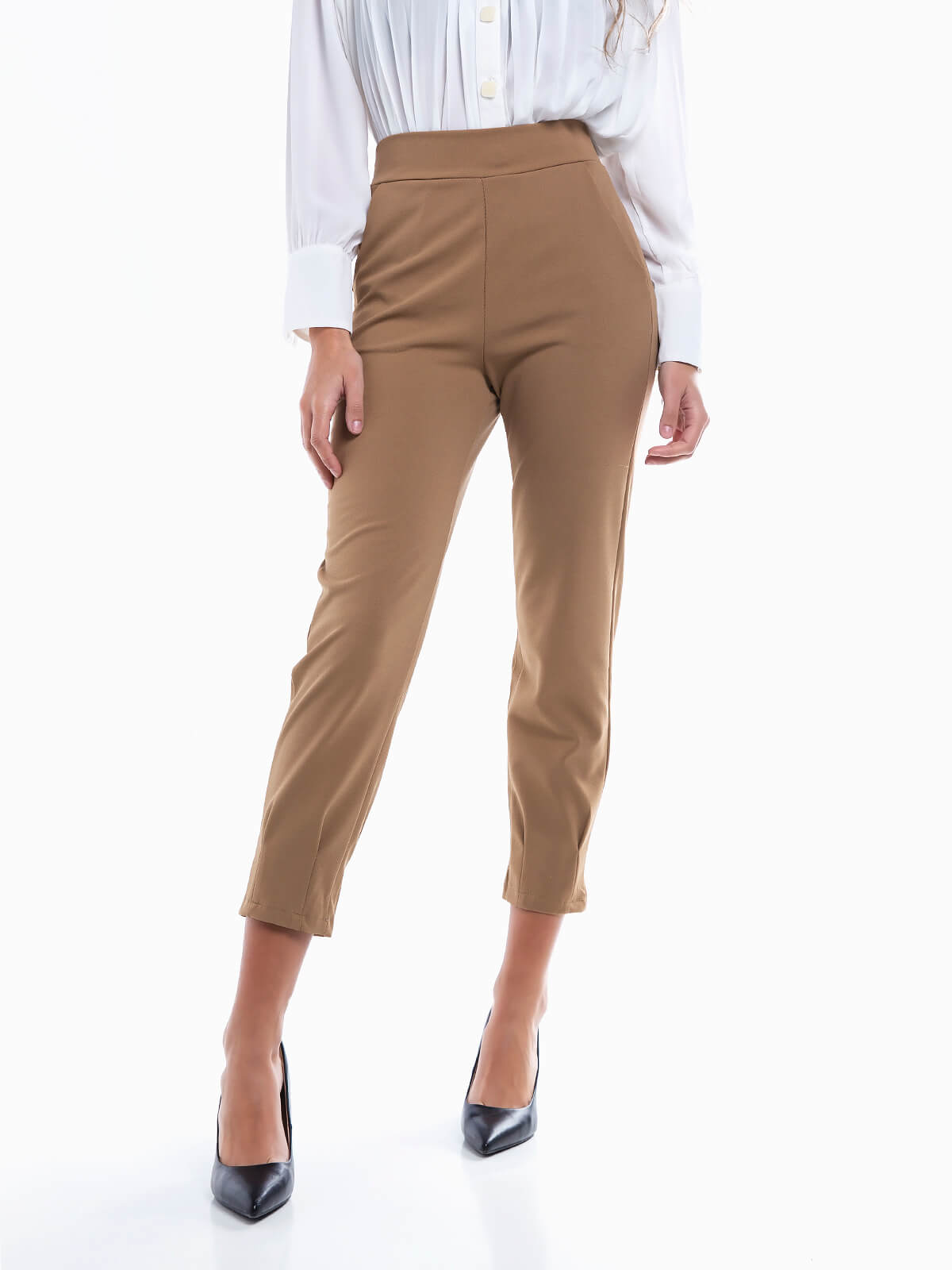 Calças de cintura elástica com pregas em baixo. Calças de cintura alta com bolsos faca laterias.