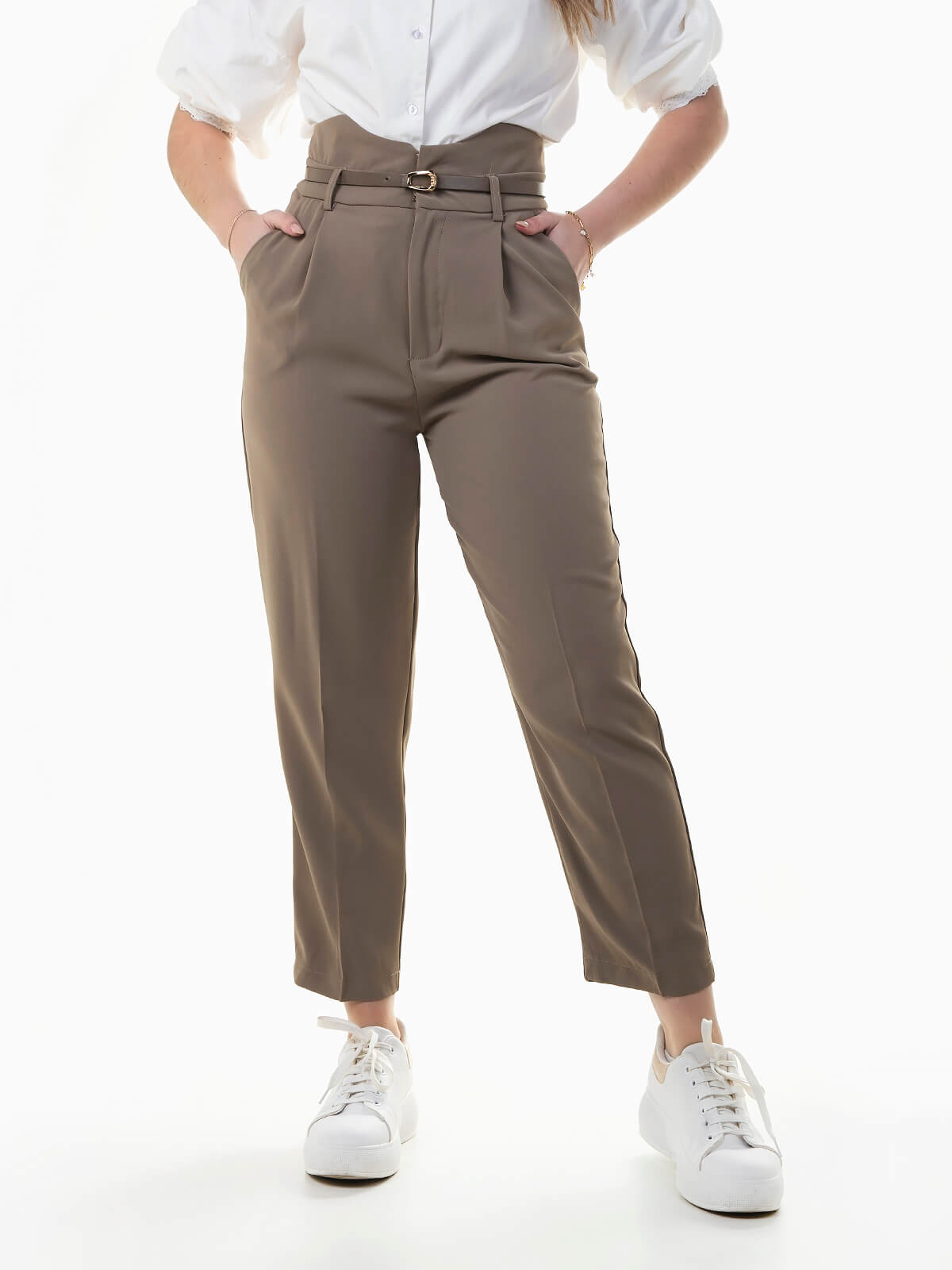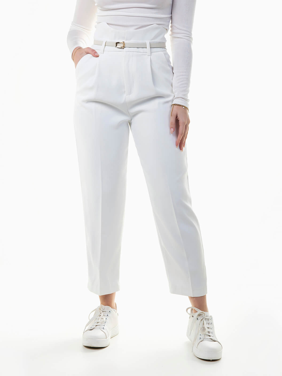 Calças de cintura subida com cinto removível em pele sintética. Calças clássicas e elegantes em tecido fluído com pormenor de pinças. 2 bolsos. Aperto fecho éclair e colchetes.