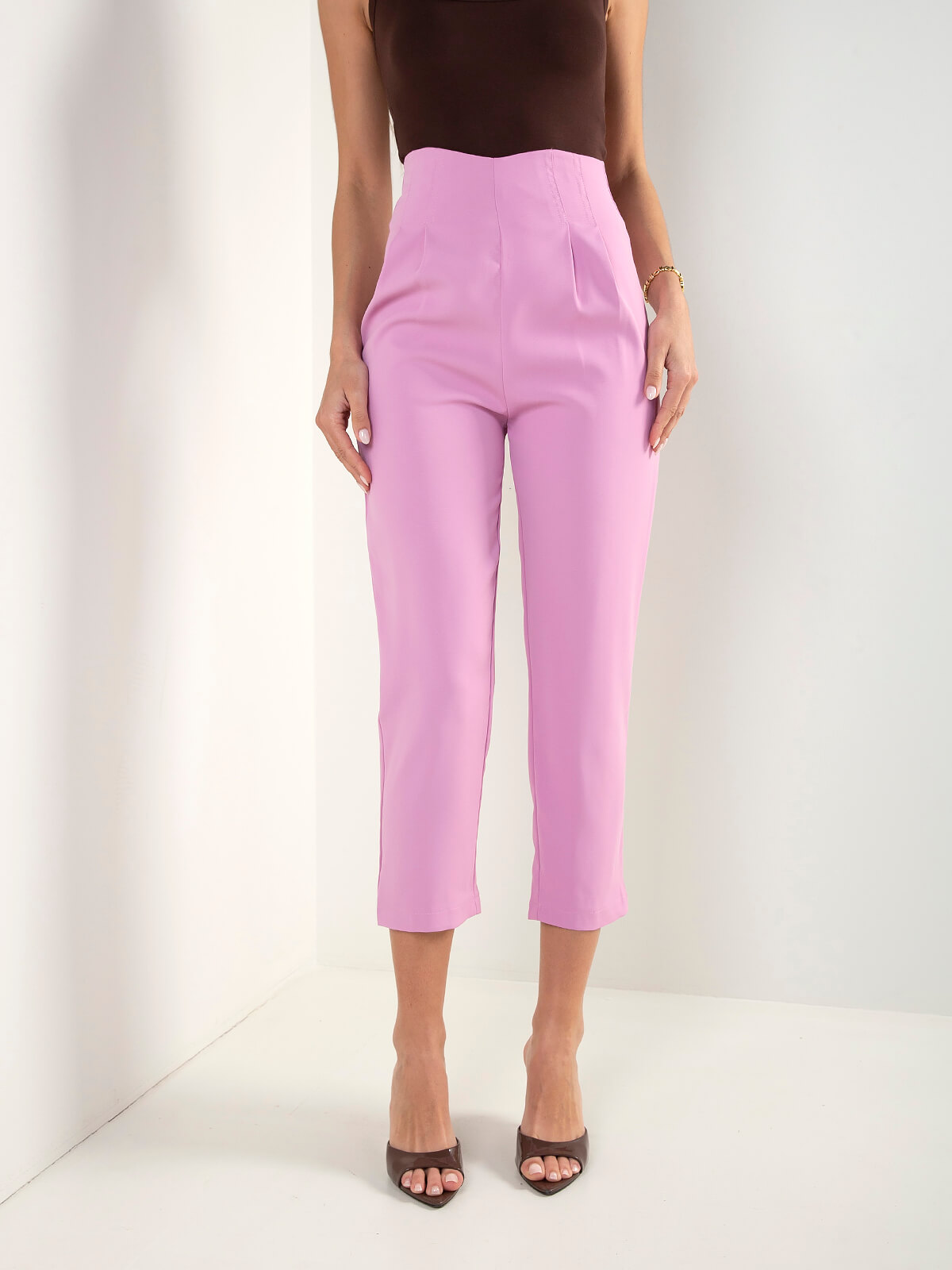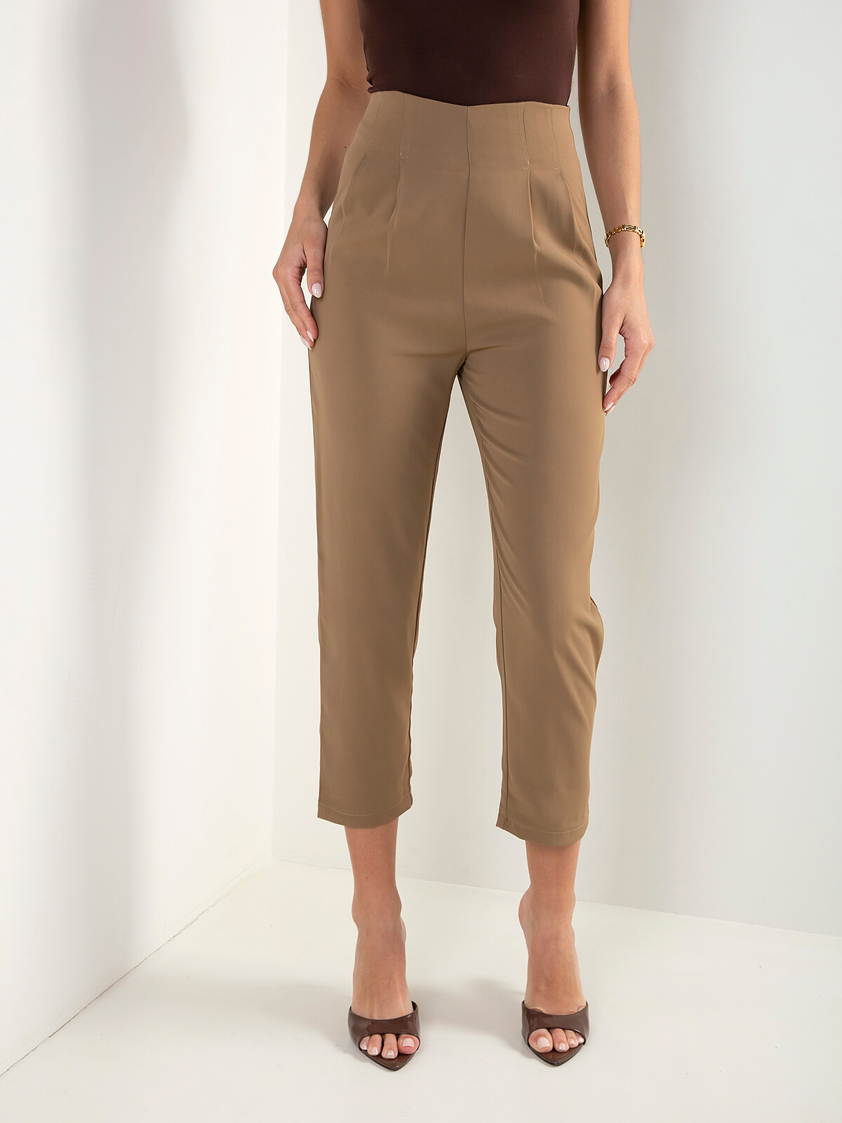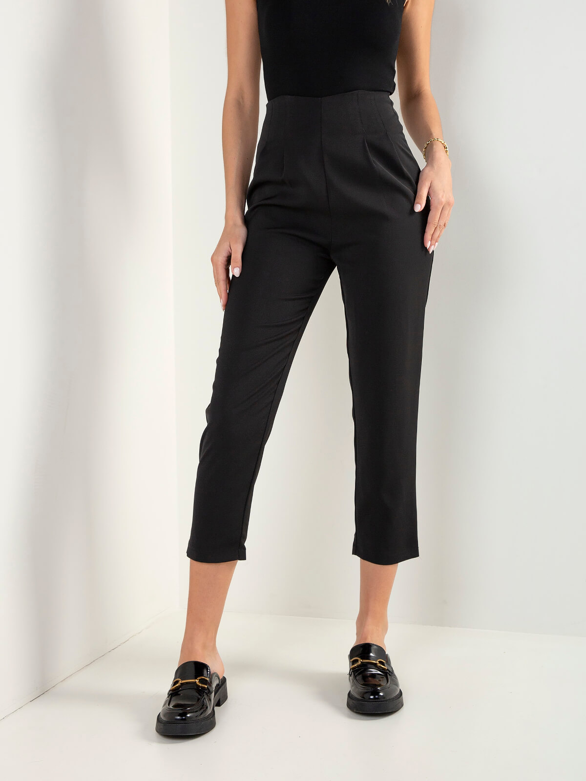 Calças de cintura subida com pregas à frente. Calças formais para senhora com aperto posterior de fecho éclair oculto na costura.