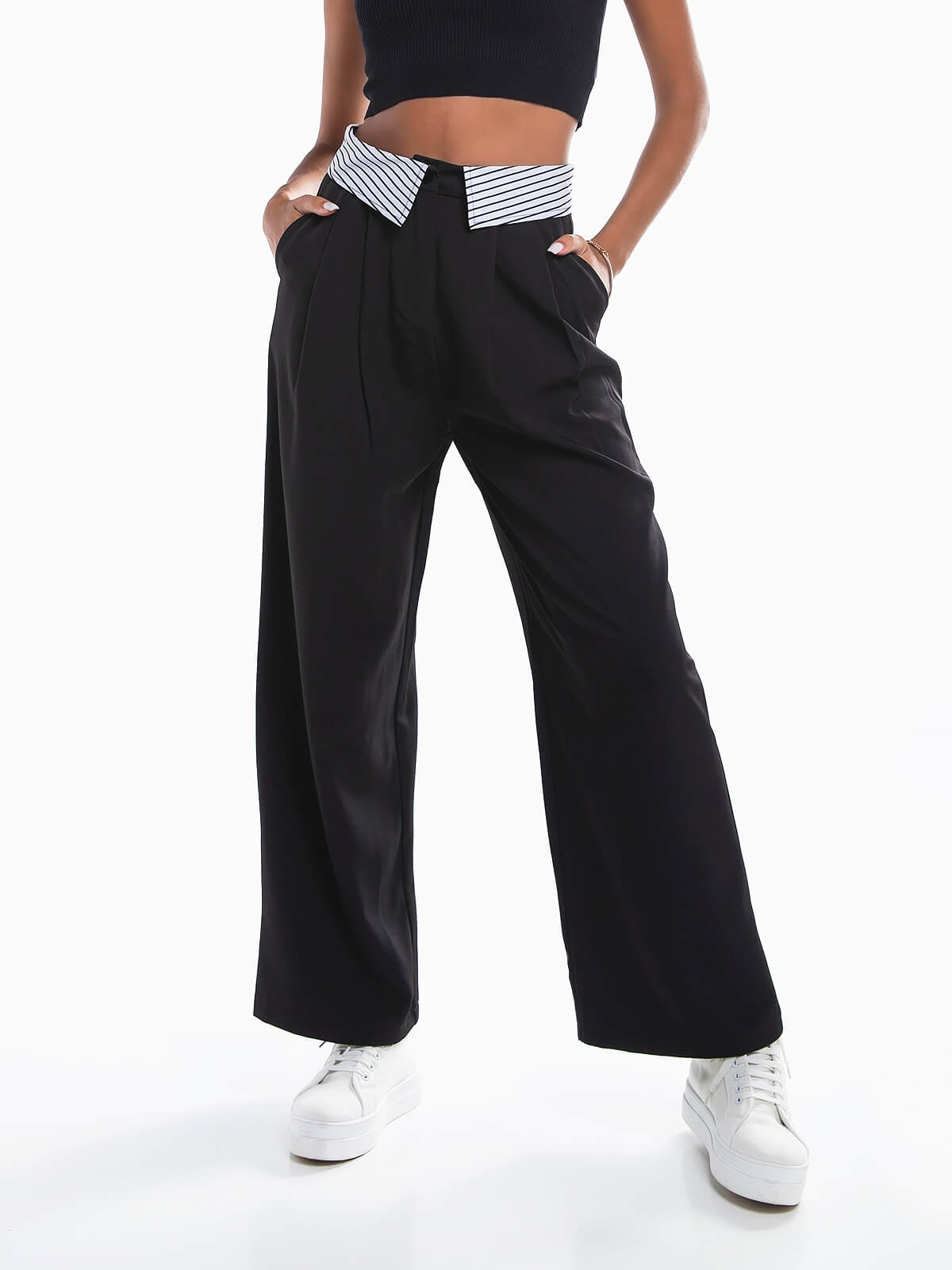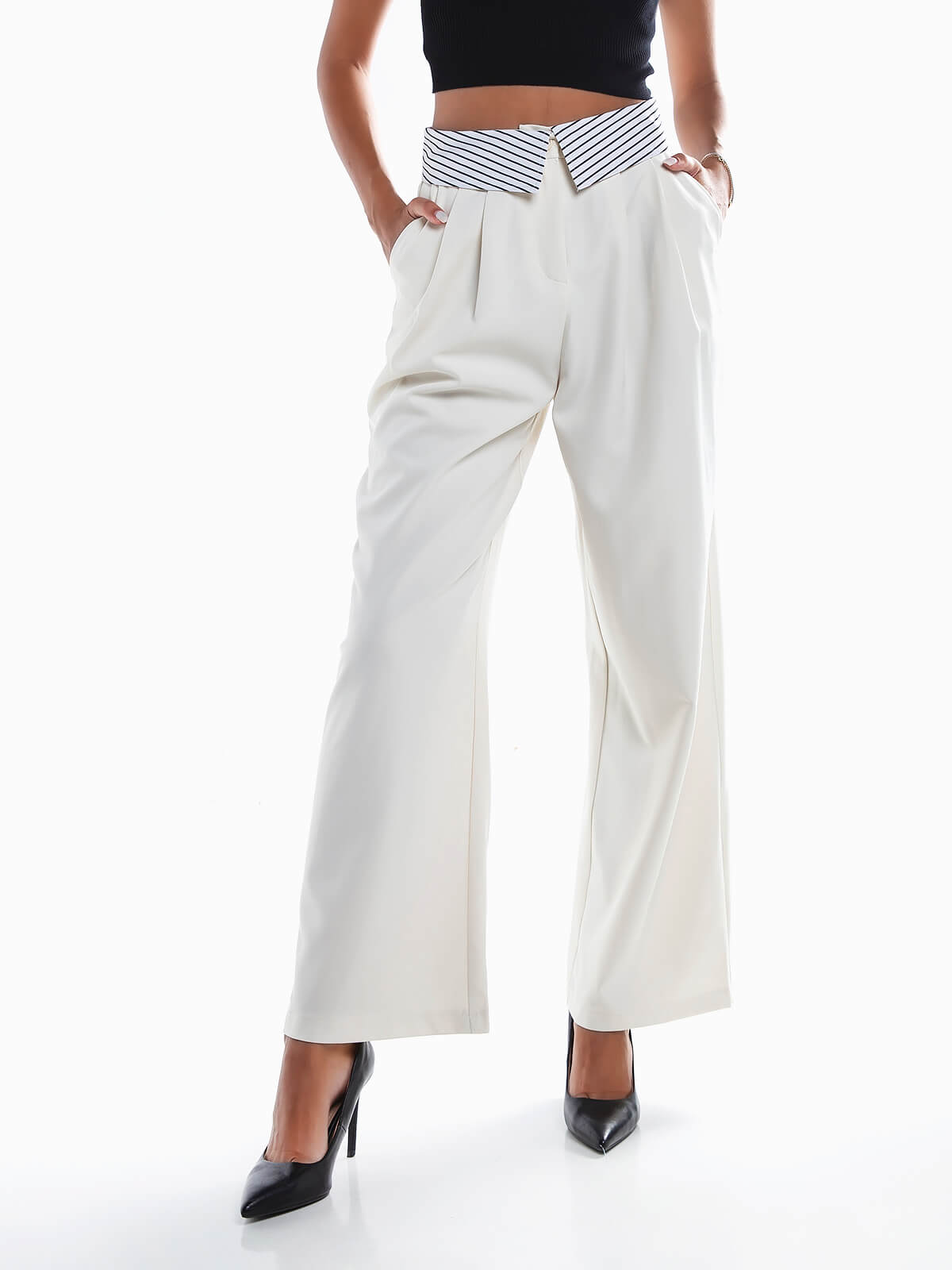 Calças com cintura virada às riscas para senhora. Calças fluídas com pormenor de pregas à frente. 2 bolsos. Cintura alta. Aperto de botão oculto e fecho zíper.