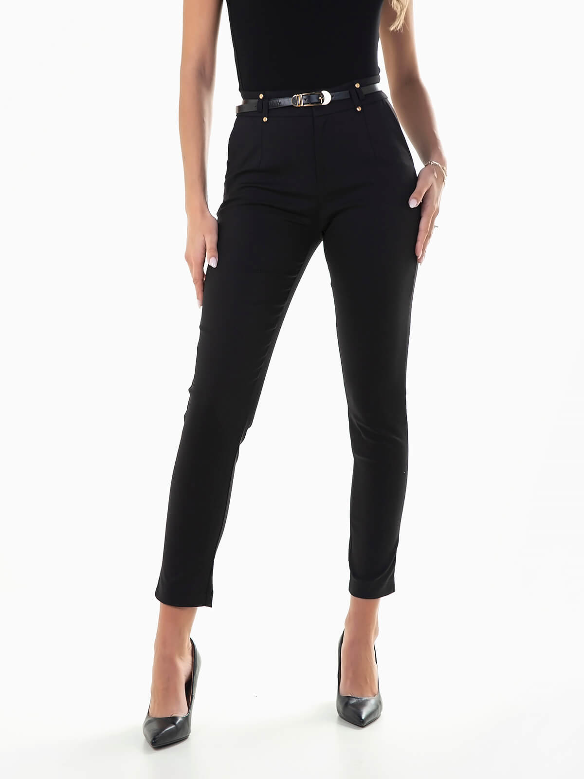 Calças clássicas de cintura alta com cinto removível em pele sintética. Calças elásticas com pormenor de pinças e 2 bolsos. Presilha dupla. Aperto de fecho éclair e botão.