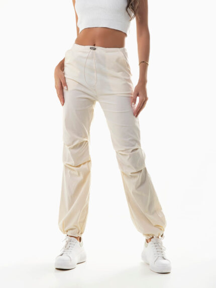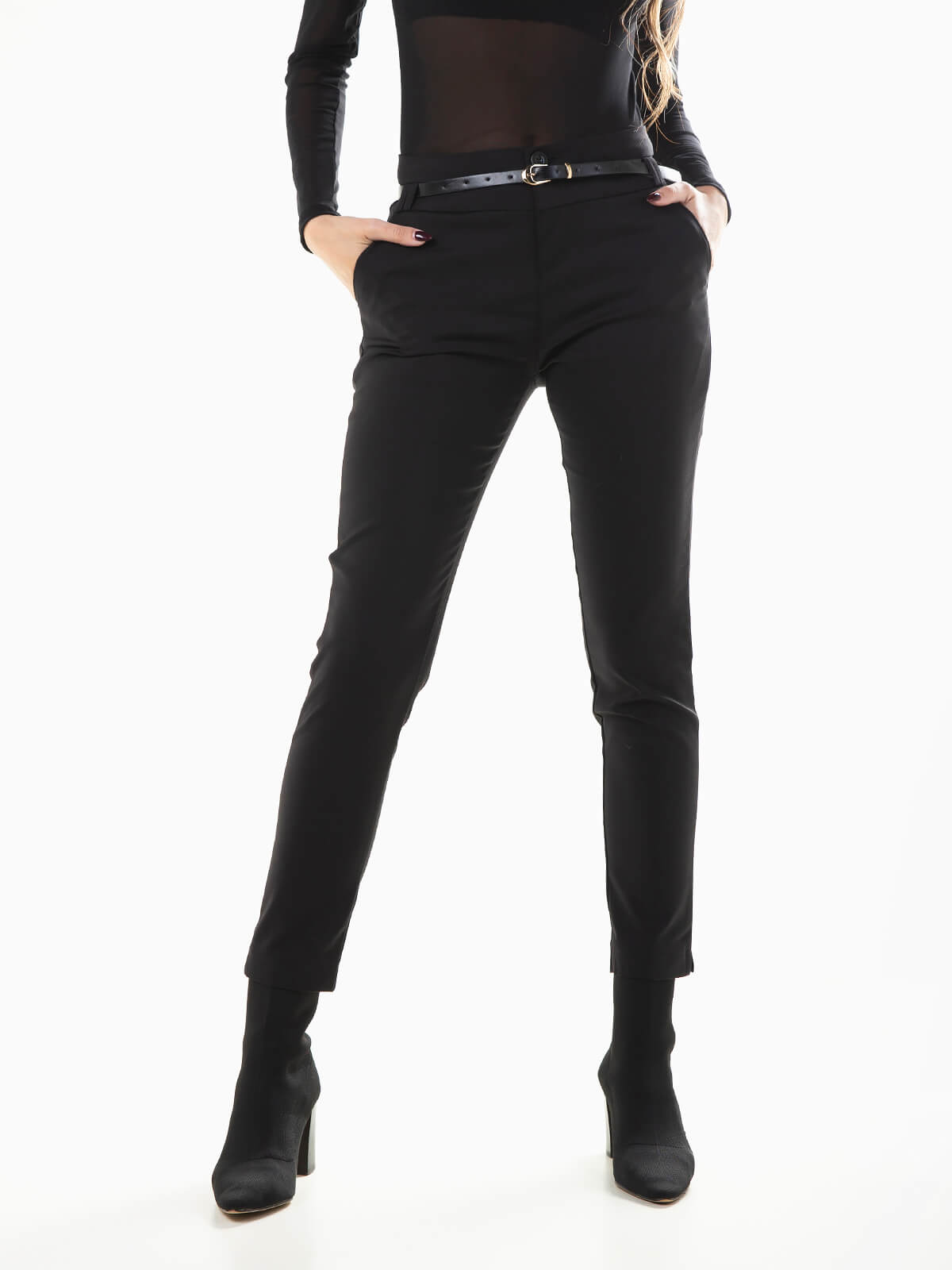 Calças clássicas para senhora com cinto para ajustar removível. Calças chino de cintura alta com aperto de fecho éclair e botão. 2 bolsos laterais.