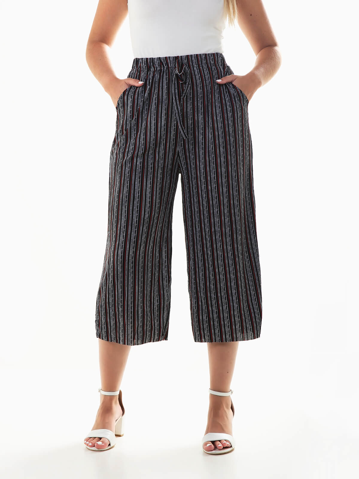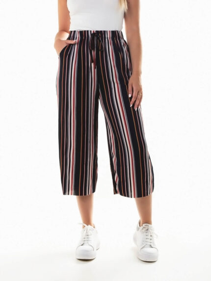 Calças culotte com estampado para senhora. Calças fluídas de cintura alta elástica com cordão para laço. 2 bolsos.