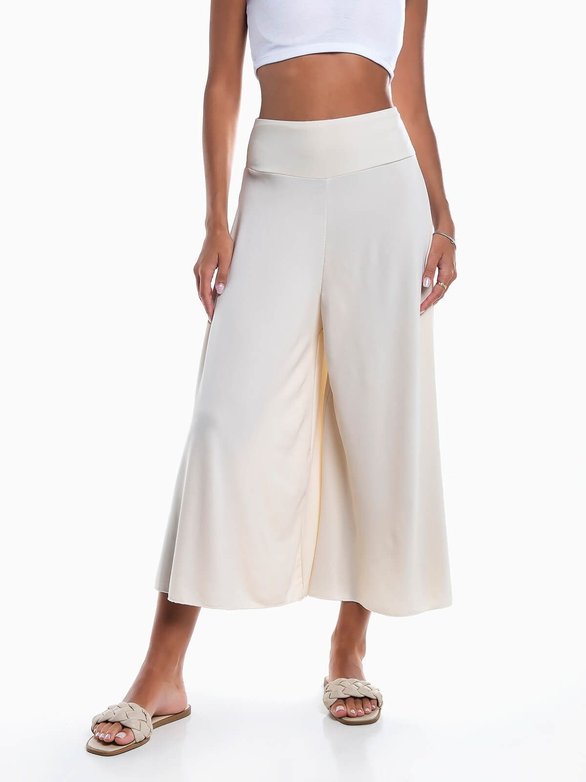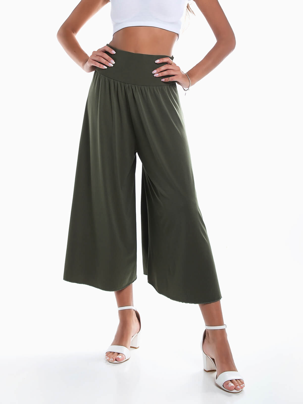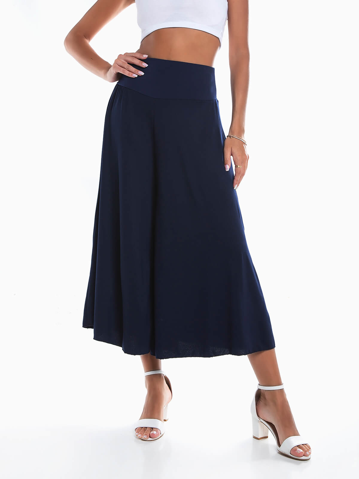 Calças culotte palazzo para senhora. Calças fluídas de cintura alta elástica.