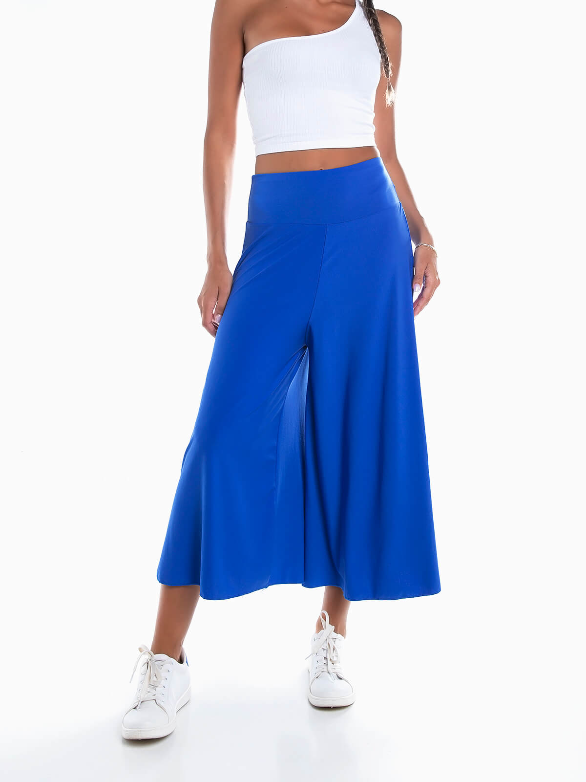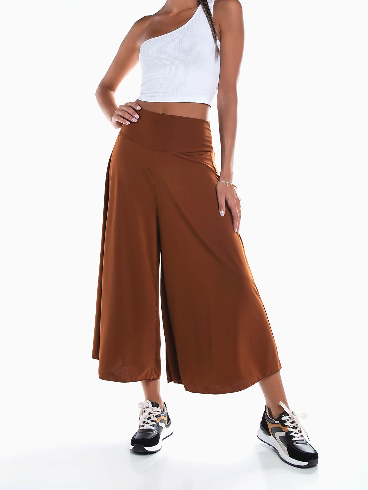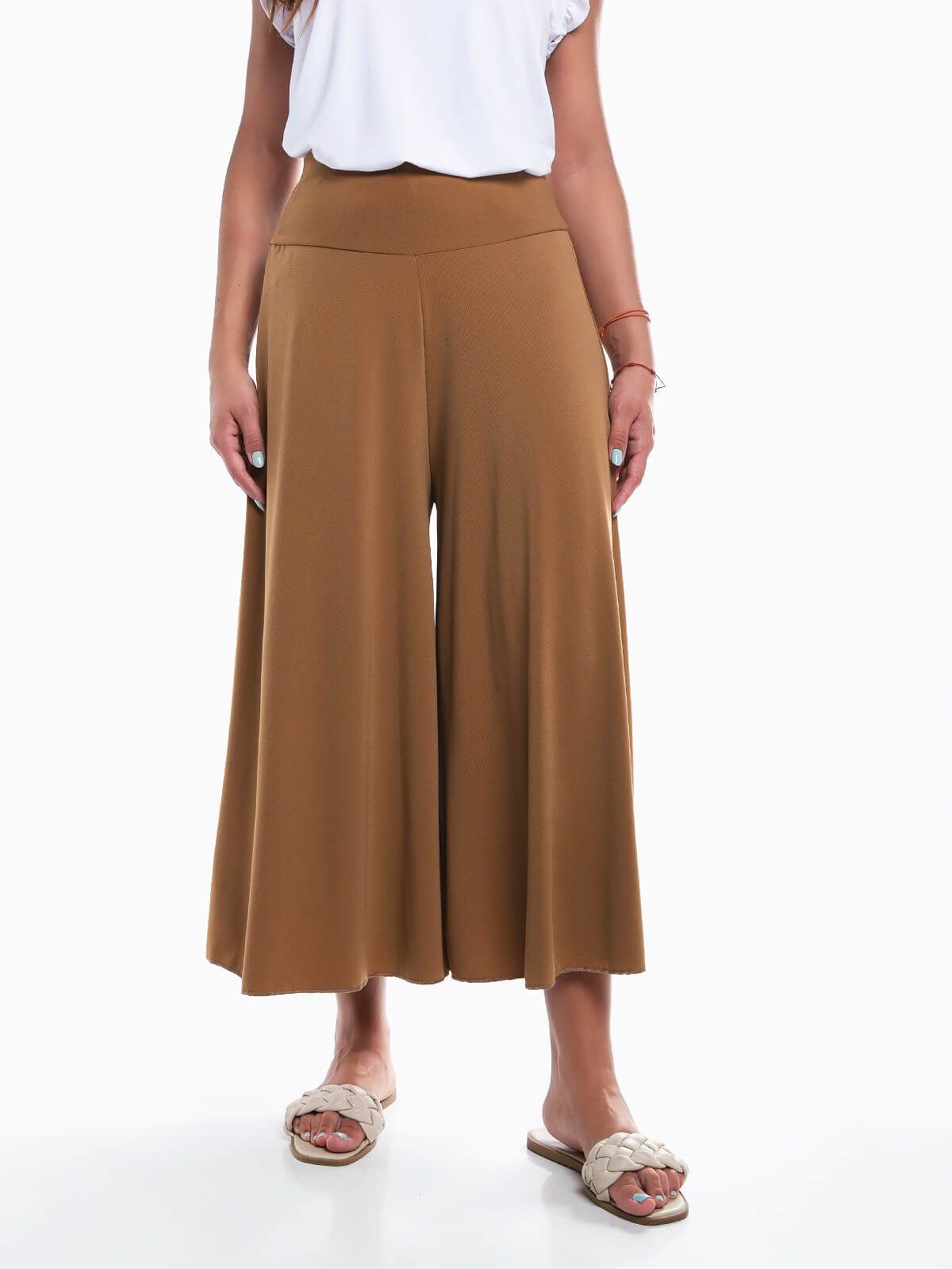 Calças culotte palazzo para senhora. Calças fluídas de cintura alta elástica.