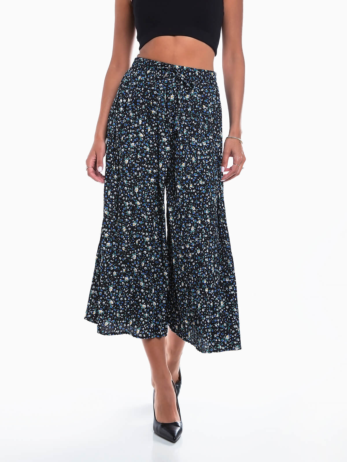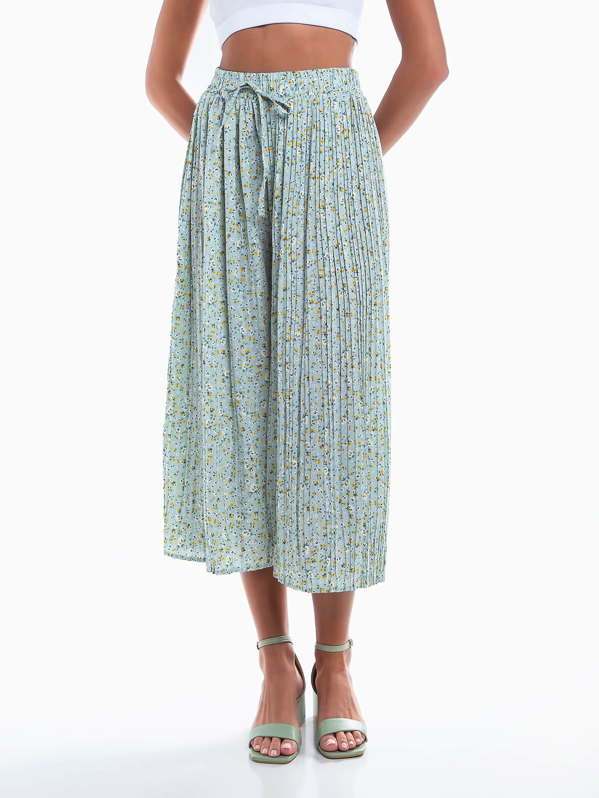 Calças culotte plissadas com flores para senhora. Calças fluídas com cintura alta elástica e cordão decorativo.