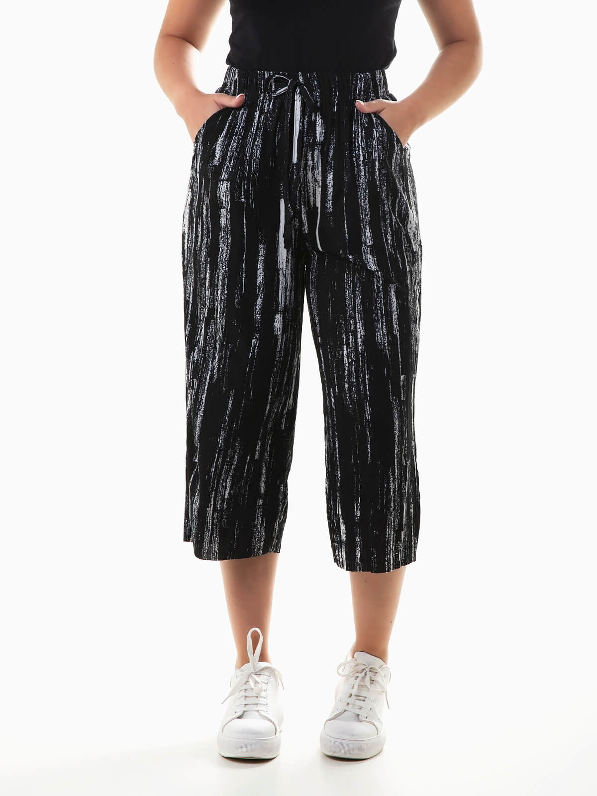 Calças culotte pretas com estampado em contraste. Calças fluídas com cintura alta elástica e cordão para laço.