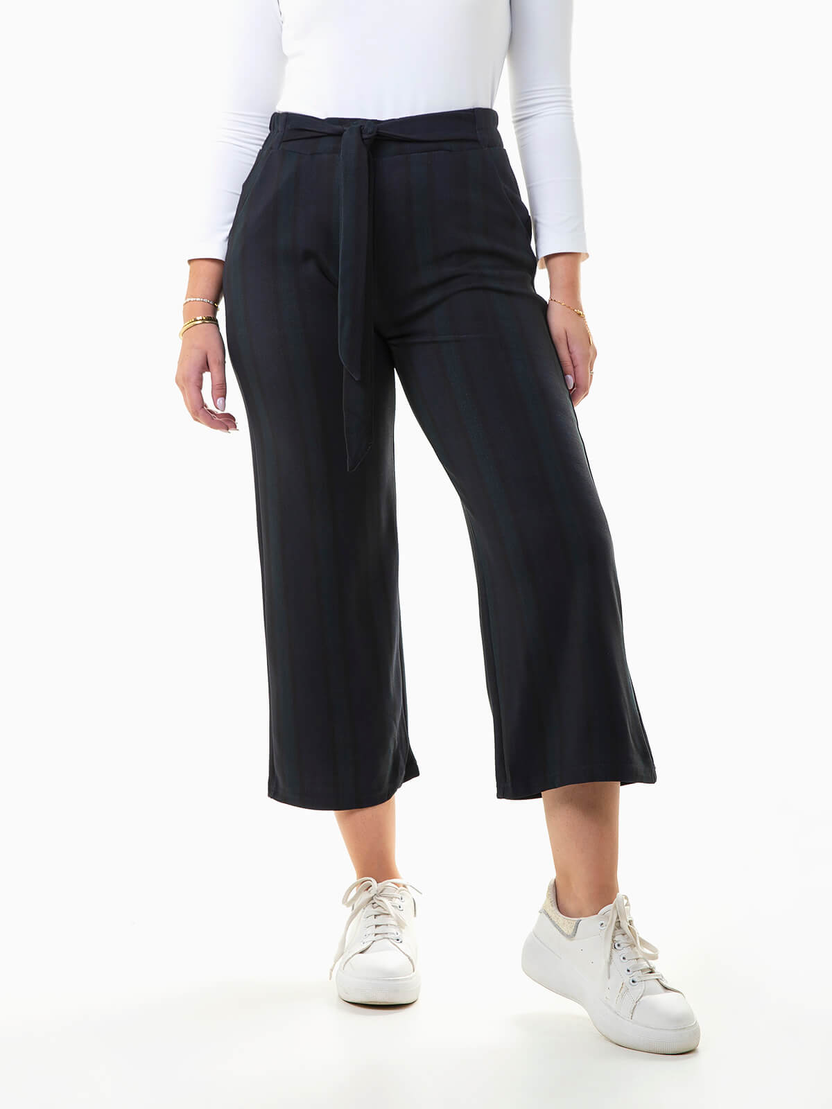 Calças curtas às riscas confecionadas em tecido mistura de viscose para maior conforto. Culottes de cintura alta elástica com 2 bolsos e tecido para laço.