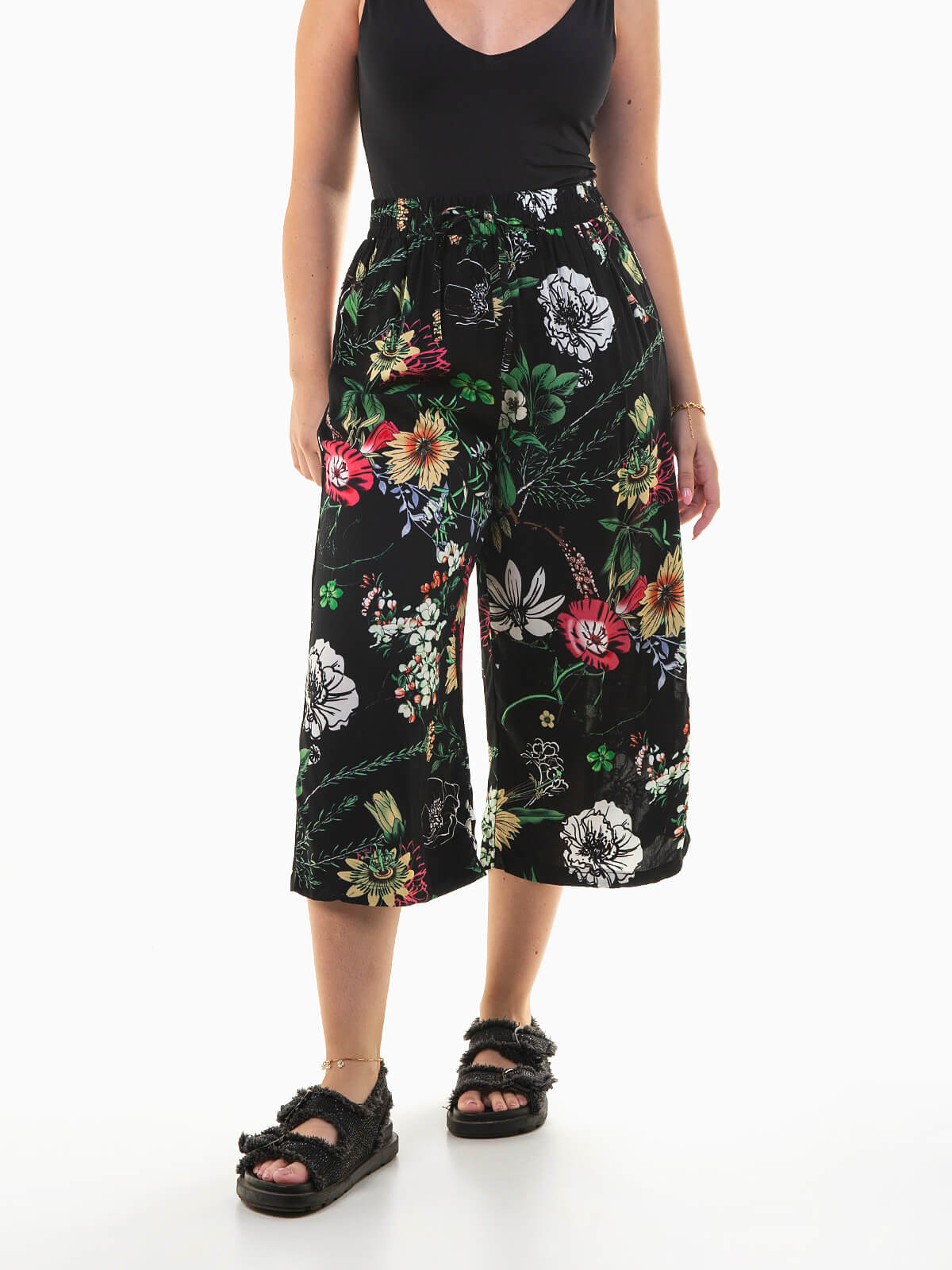 Calças curtas fluídas com cintura alta elástica e cordão para laço decorativo. Dois bolsos práticos e estampado floral que traz frescura e estilo descontraído. Perfeitas para dias quentes.