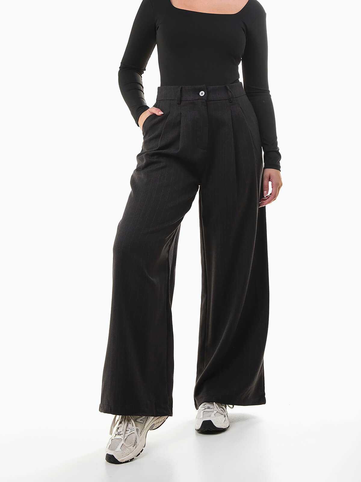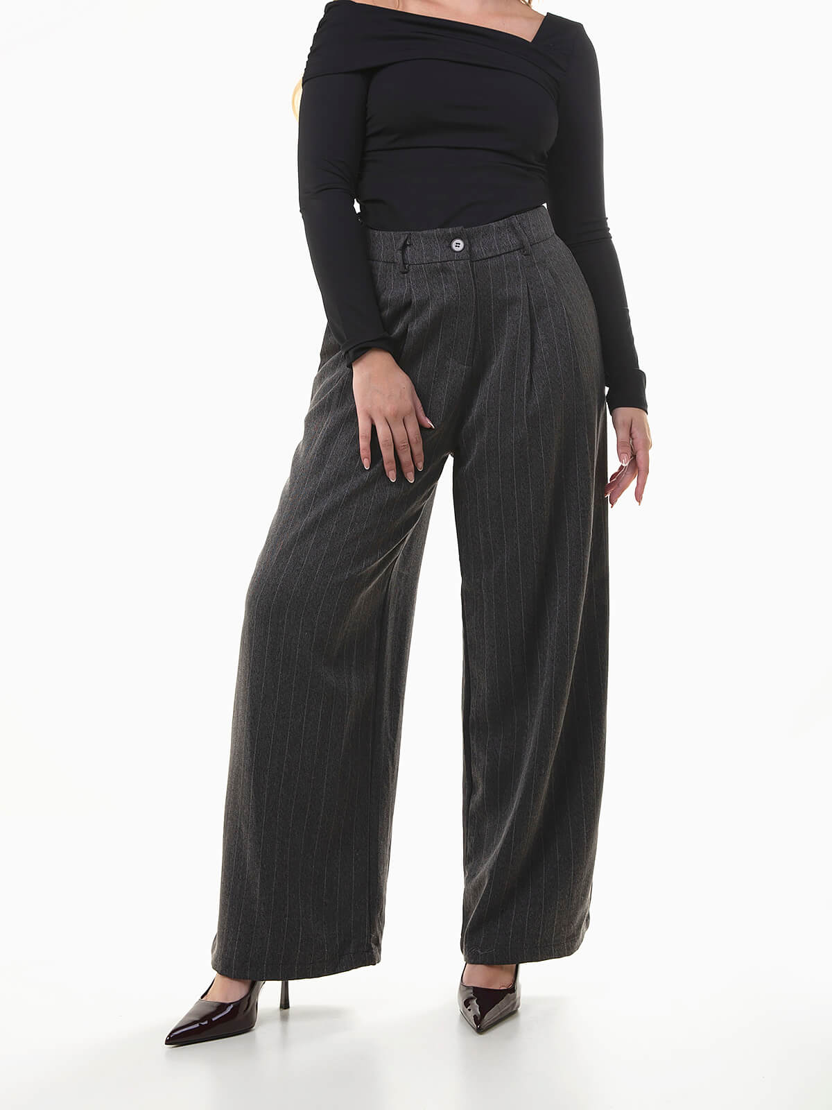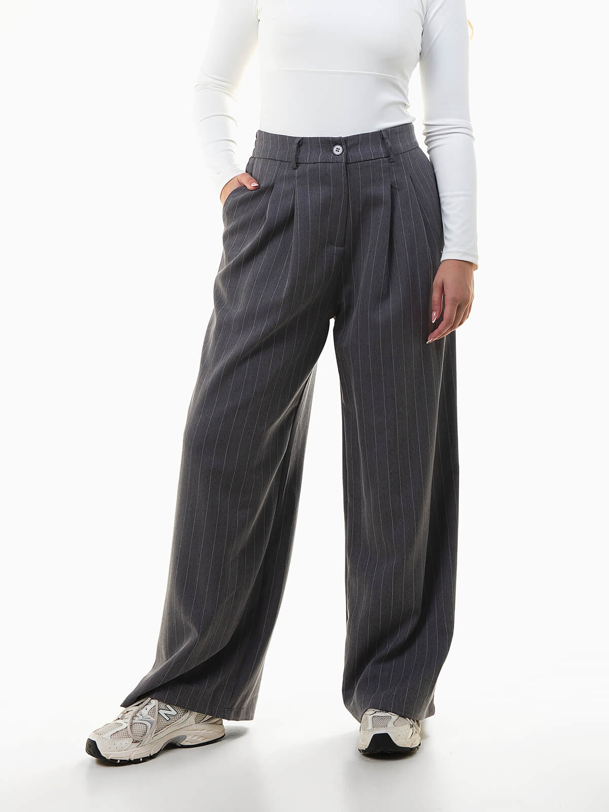Calças femininas de alfaiataria em padrão riscas diplomáticas. Modelo de cintura alta com cós elástico na parte posterior para maior conforto, pregas frontais e aperto de fecho-éclair e botão. Uma opção sofisticada e moderna que faz conjunto com o blazer a combinar.