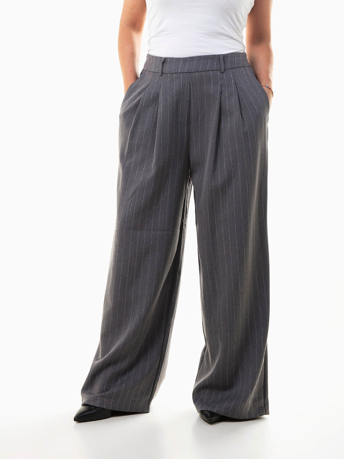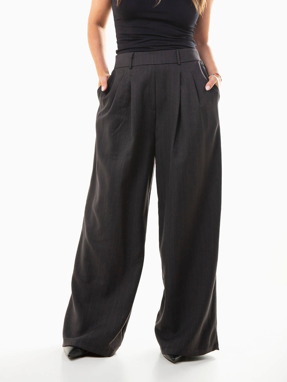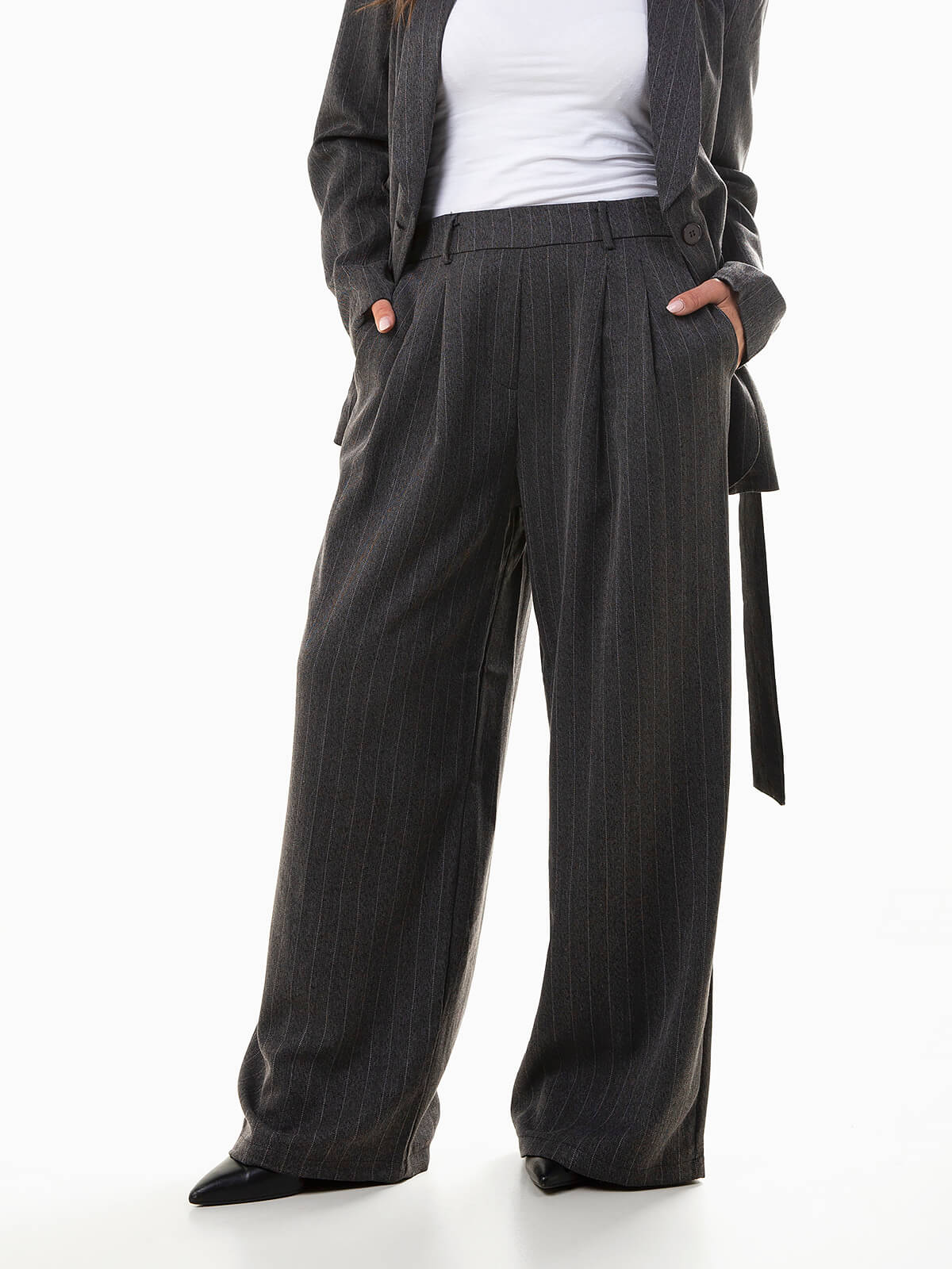 Calças femininas de fato com padrão de riscas diplomáticas. Modelo elegante de cintura alta com cós elástico na parte posterior, pinças frontais e corte fluído que garante conforto e sofisticação em cada look. Uma peça versátil e moderna que combina facilmente com o blazer a condizer ou com uma camisa simples para um toque mais casual-chic.