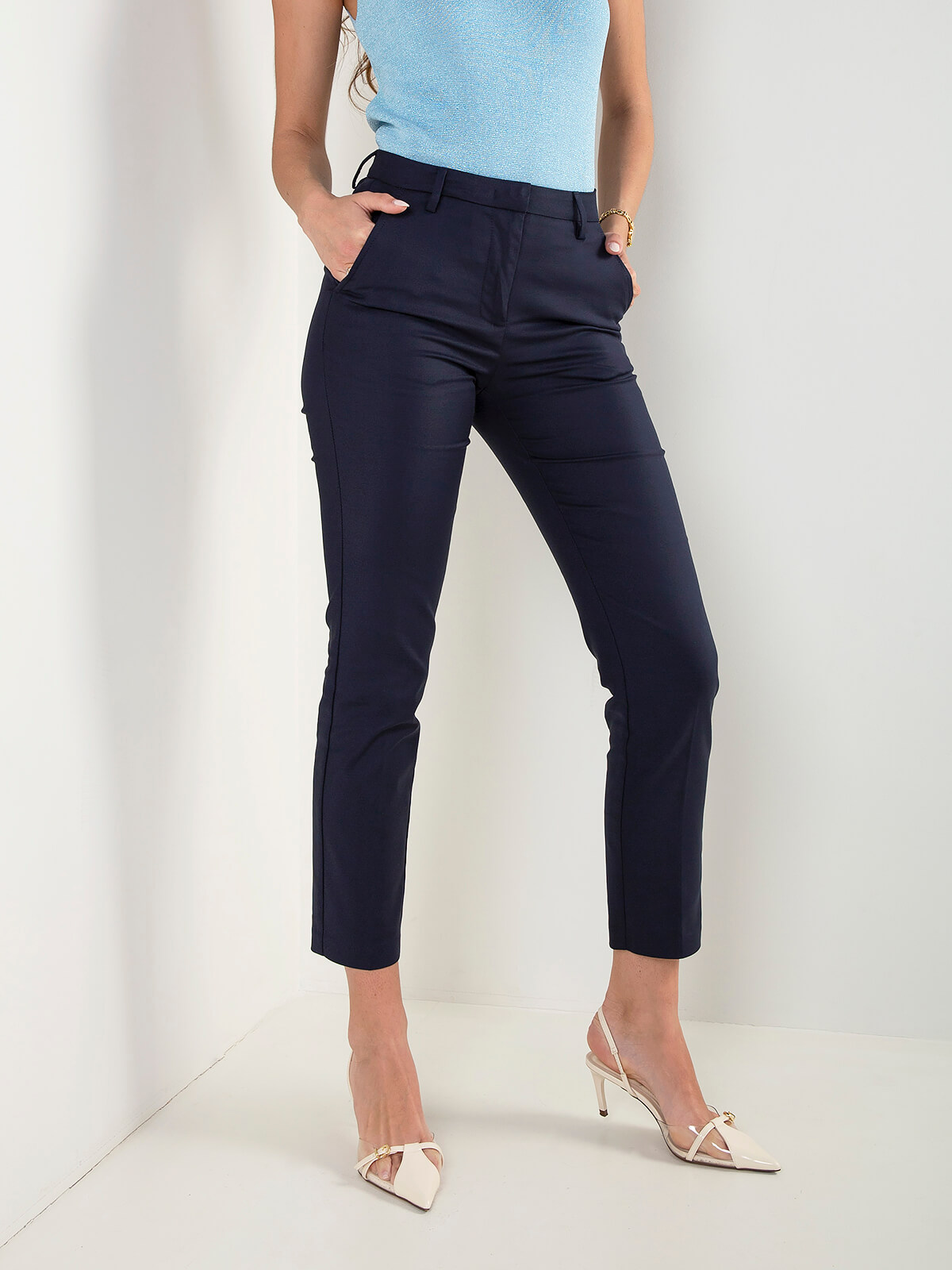 Calças de alfaiataria com cintura média, presilhas e aperto frontal com fecho éclair e botão. Bolsos laterais discretos e corte slim que acompanha a silhueta de forma elegante. Um essencial versátil, ideal para looks formais ou combinações mais descontraídas com um toque sofisticado.