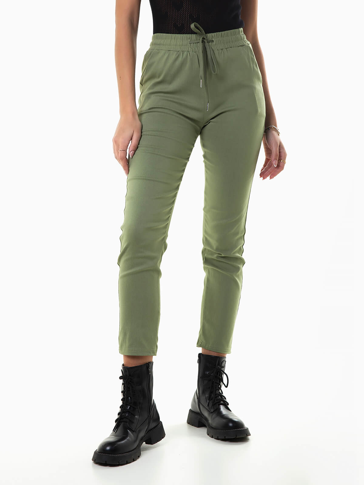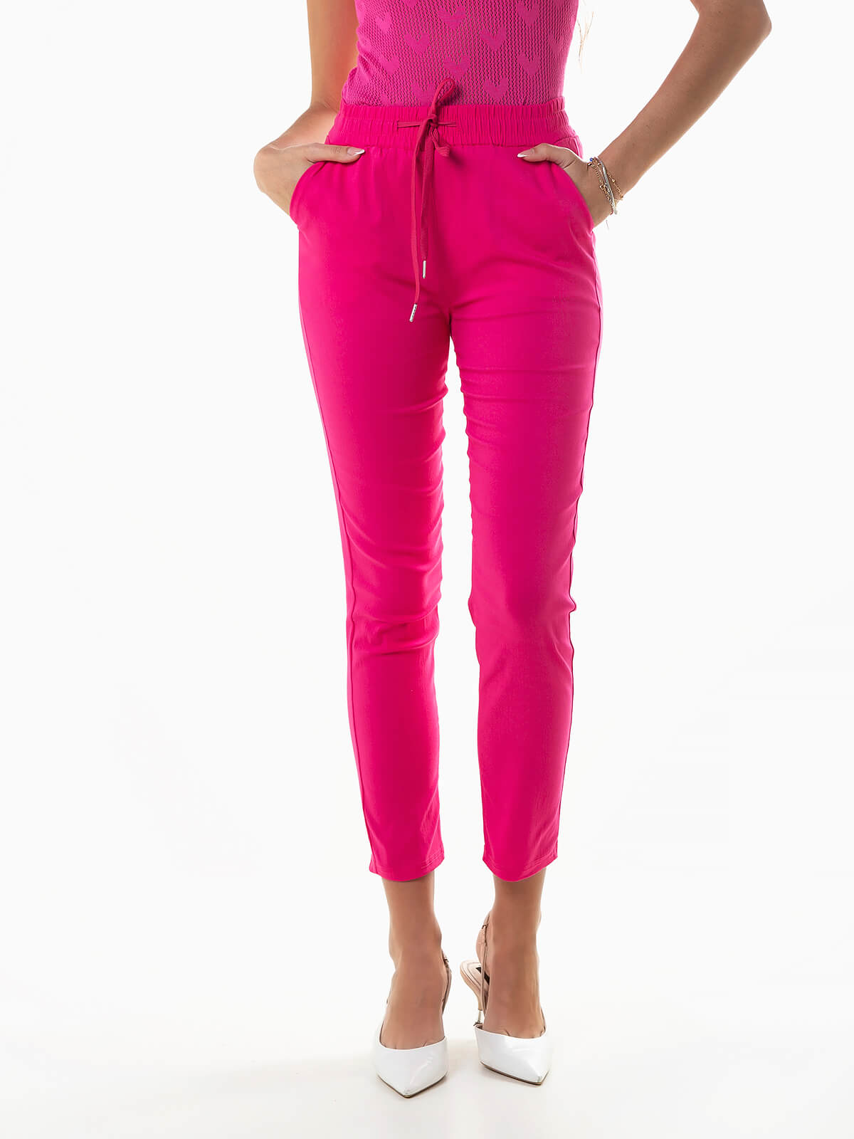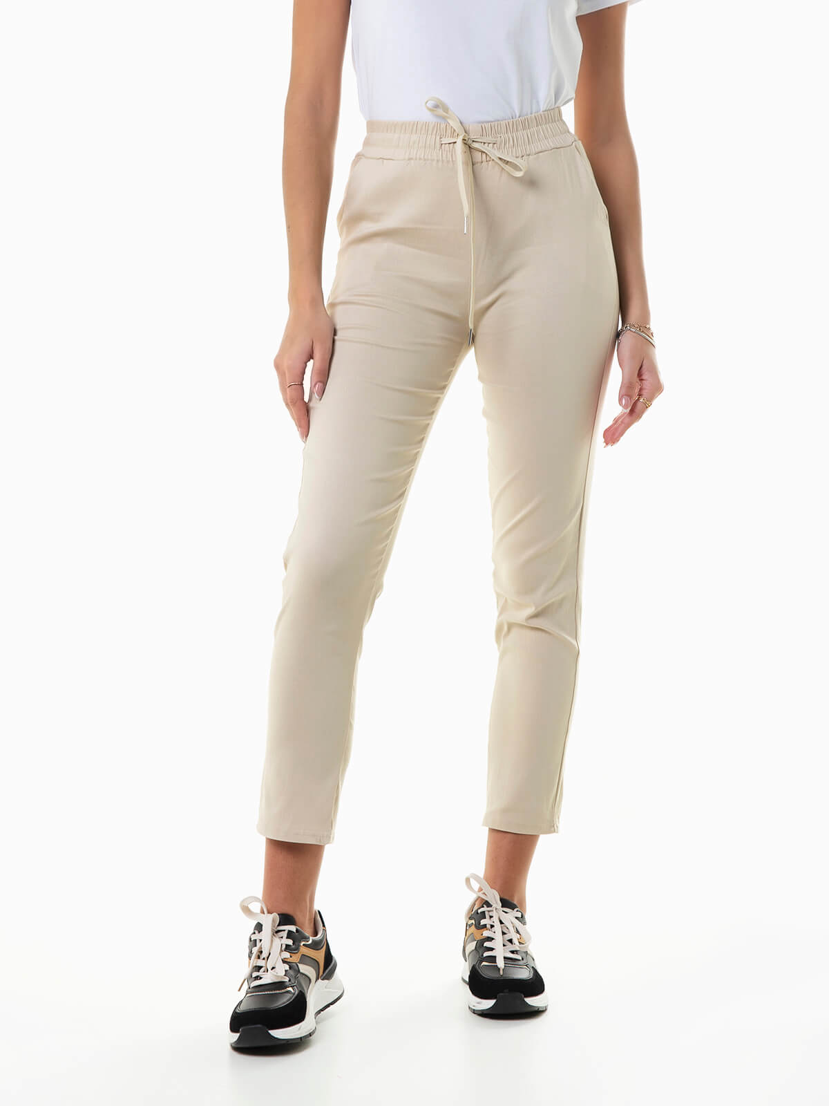 Calças de cintura alta elástica e cordão para ajustar. Calças para senhora com 2 bolsos.