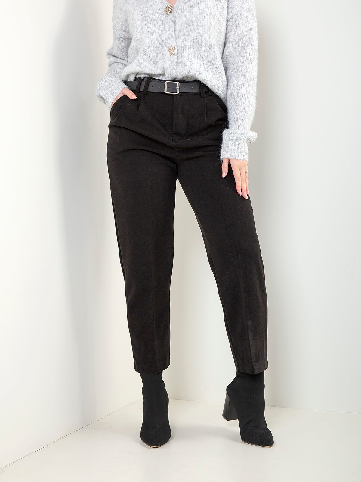 Calças estilo fazenda com cintura alta e corte de alfaiataria. Modelo com pregas frontais, bolsos laterais funcionais e cinto incluído no mesmo tom. Fecho frontal discreto e perna reta, ideal para looks de trabalho ou combinações mais sofisticadas no dia a dia.