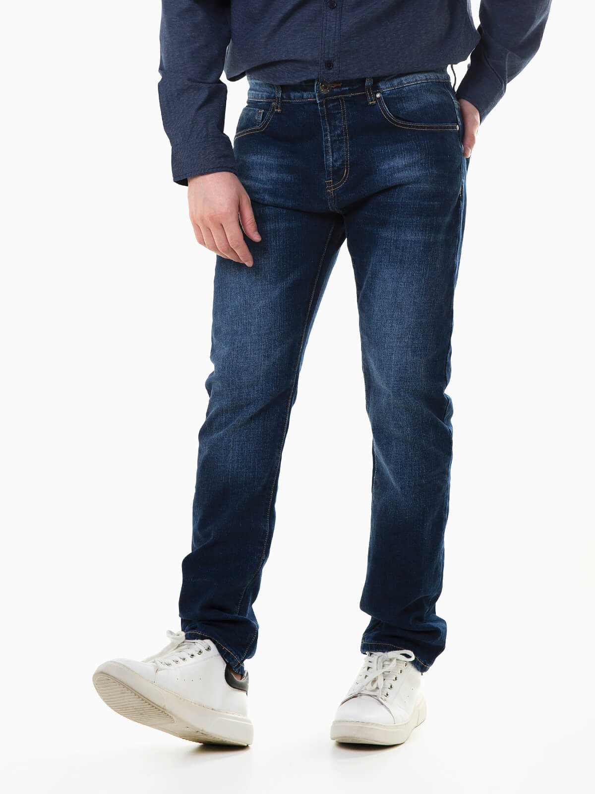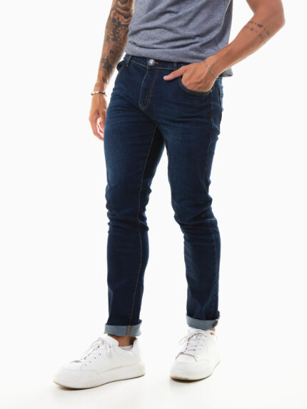 Calças de ganga com lavagem azul escuro para homem. Jeans slim fit elásticas com 5 bolsos. Aperto de botões.
