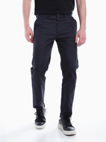 Calças de ganga com aperto de botões para homem. Jeans elásticas com lavagem azul escuro e 5 bolsos.