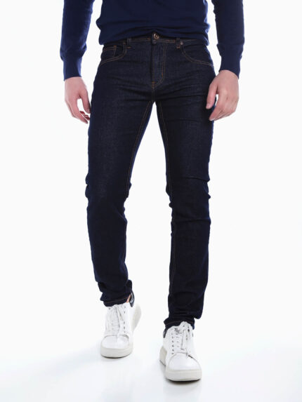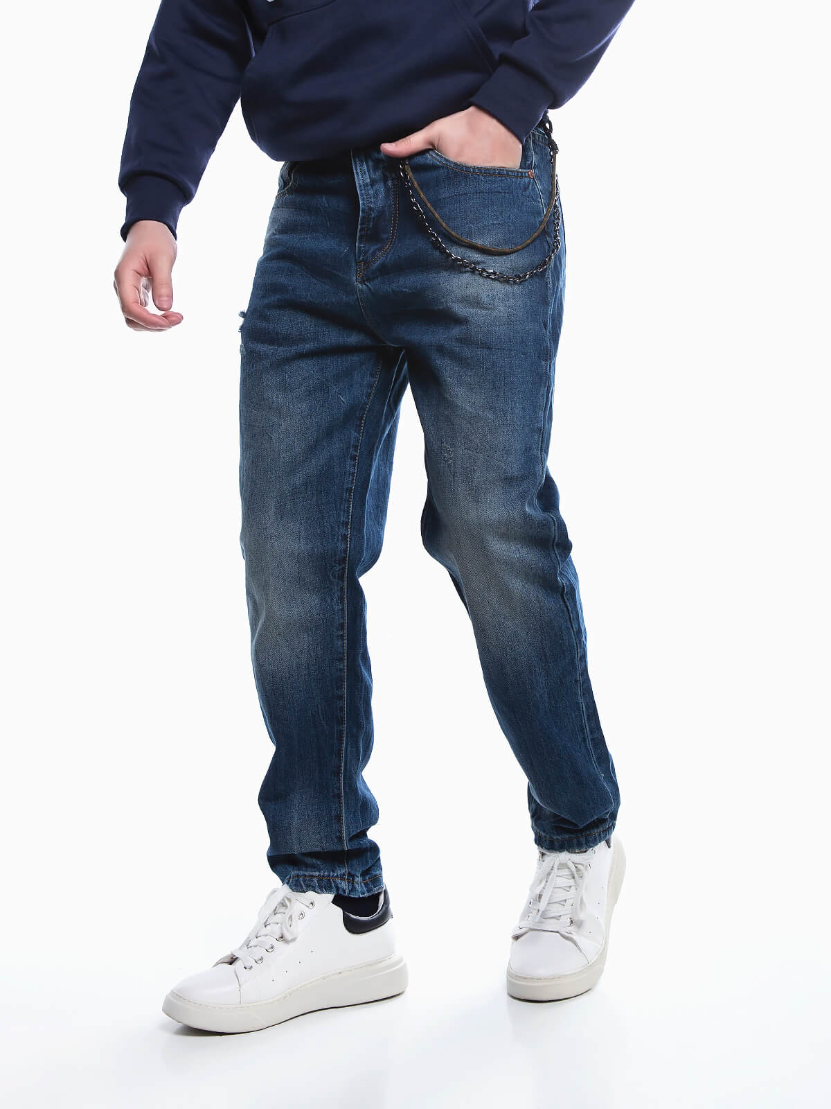 Calças de ganga com corrente amovível para homem. Jeans com leves rotos e lavagem manchada. 5 bolsos. Aperto frontal de botões.