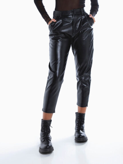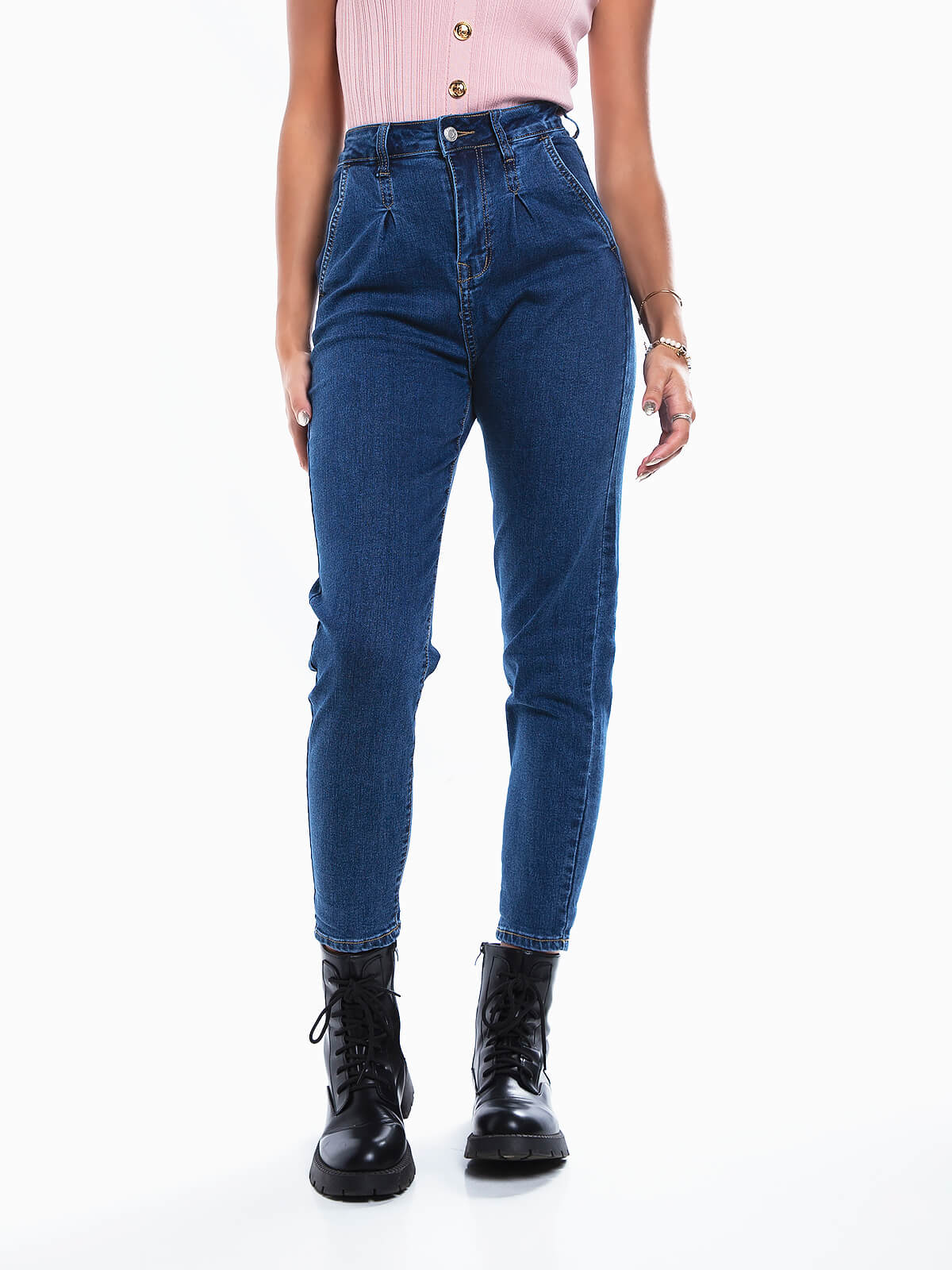 Calças de ganga com pregas para senhora. Jeans elásticas de cintura alta. 4 bolsos. Lavagem azul escuro. Aperto de fecho éclair e botão.