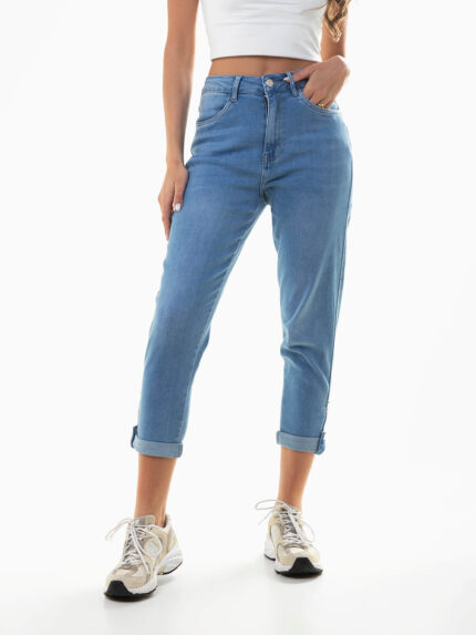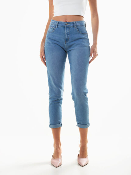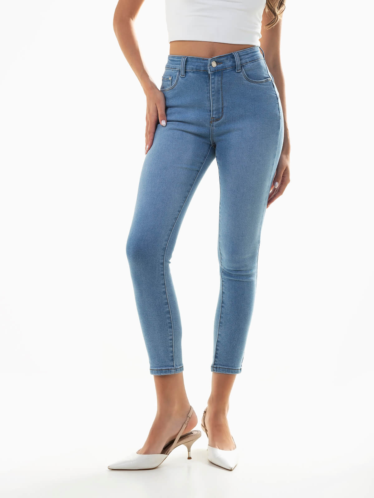 Calças de ganga skinny com efeito push-up para mulher. Skinny jeans de cintura alta com lavagem azul claro e 5 bolsos. Aperto de fecho éclair e botão.