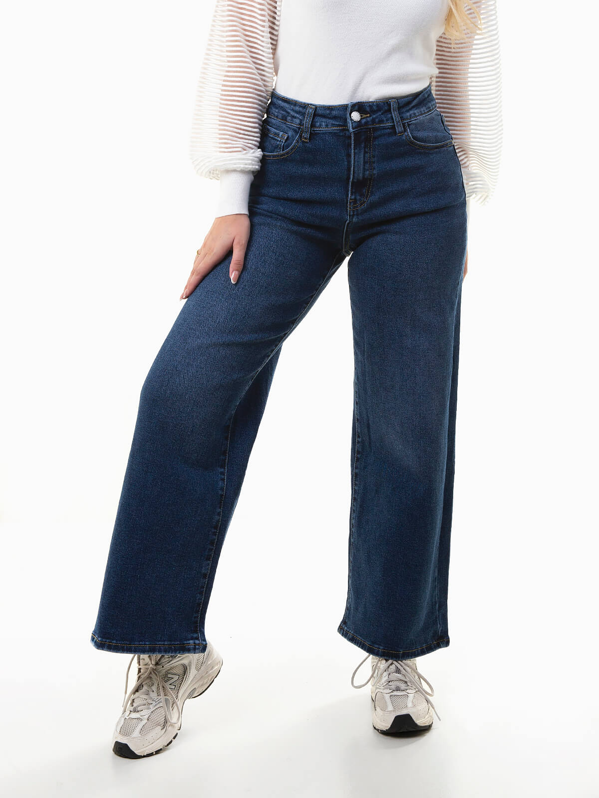 Calças ganga wide leg com cinco bolsos, cintura alta e lavagem azul escuro. Confortáveis e com toque moderno, perfeitas para looks casuais de dia. Usa com t-shirts, malhas ou sneakers para um estilo descontraído e atual.