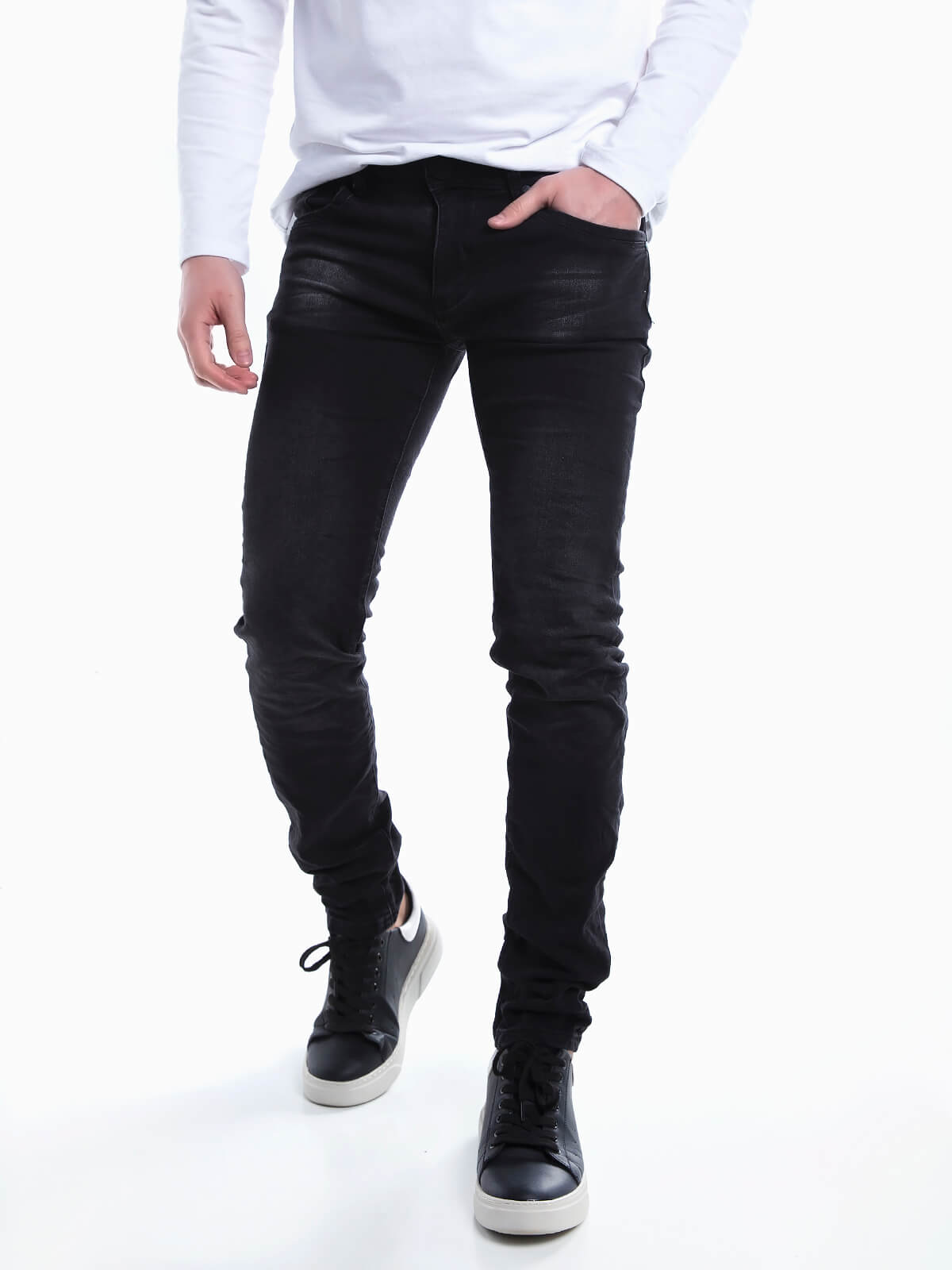Calças de ganga pretas para homem. Jeans elásticas com 5 bolsos. Aperto de fecho éclair e botão.