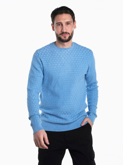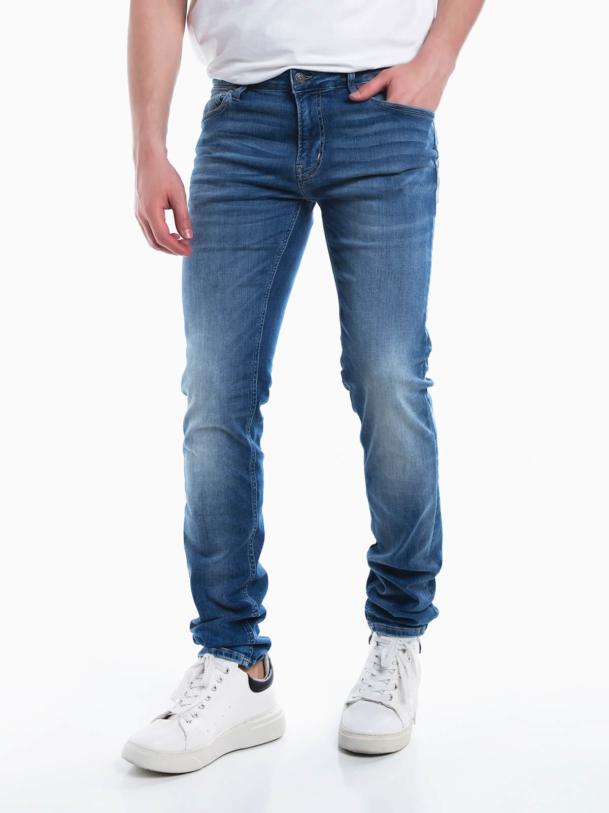 Calças de ganga skinny fit elásticas para homem. Jeans com lavagem azul claro. 5 bolsos. Aperto de fecho éclair e botão.