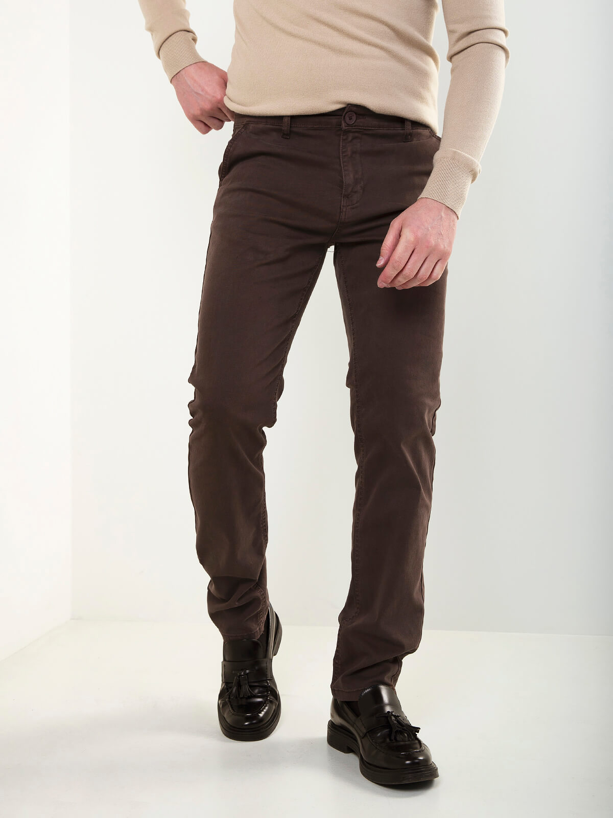 Calças chino de sarja slim fit, com corte ajustado, bolsos laterais e traseiros e fecho com botão e zíper. Para um visual mais casual, resulta na perfeição com sweatshirt ou malha texturada e sapatilhas.