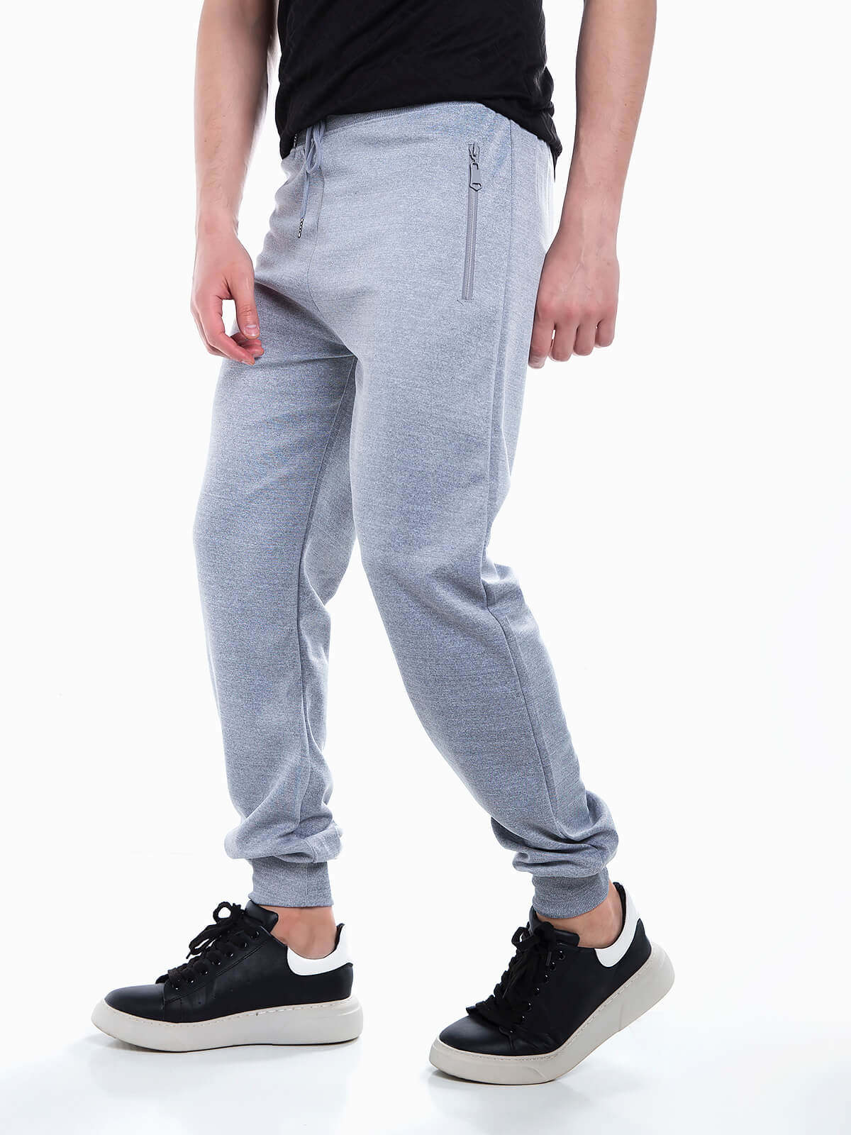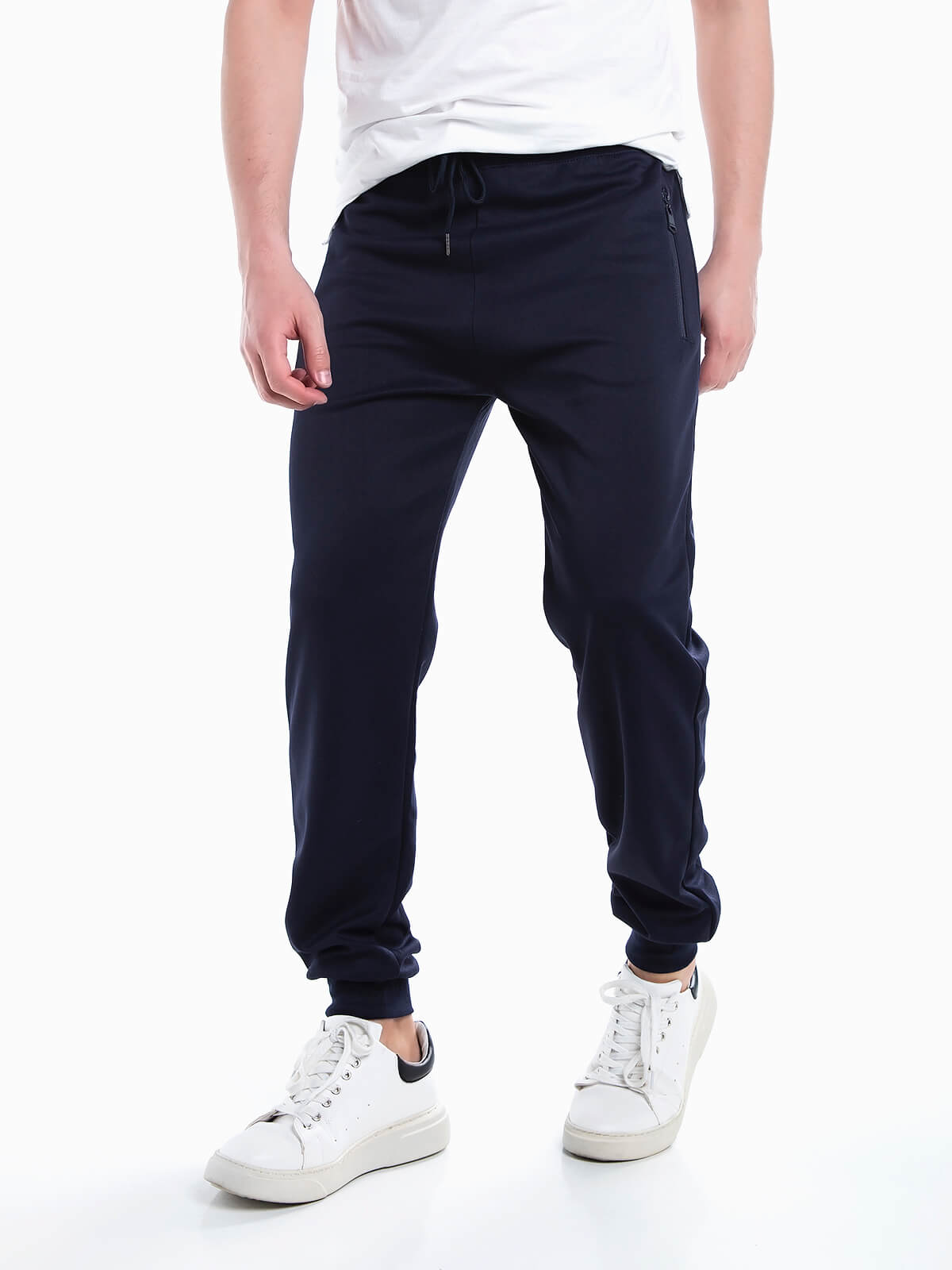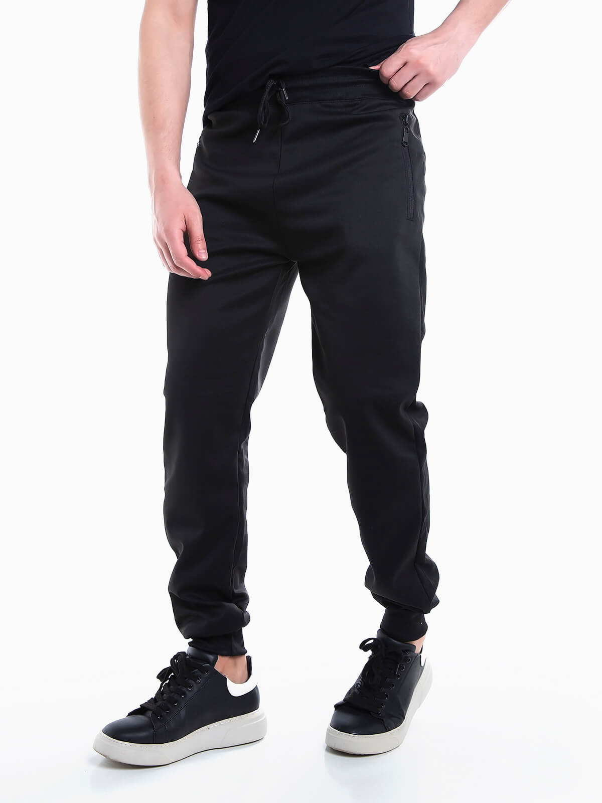 Calças desportivas básicas em tecido acetato para homem. Calças jogger com cintura e punhos elásticos. Cordão para ajustar. 2 bolsos.