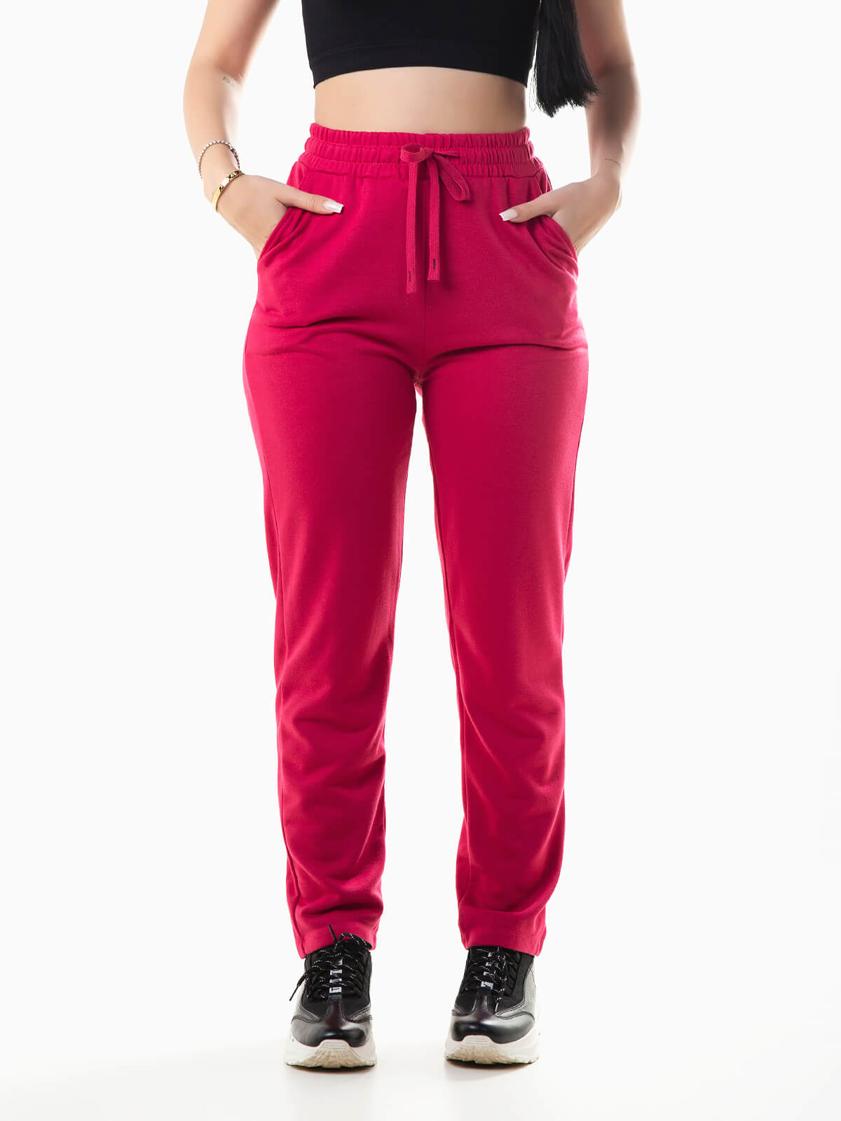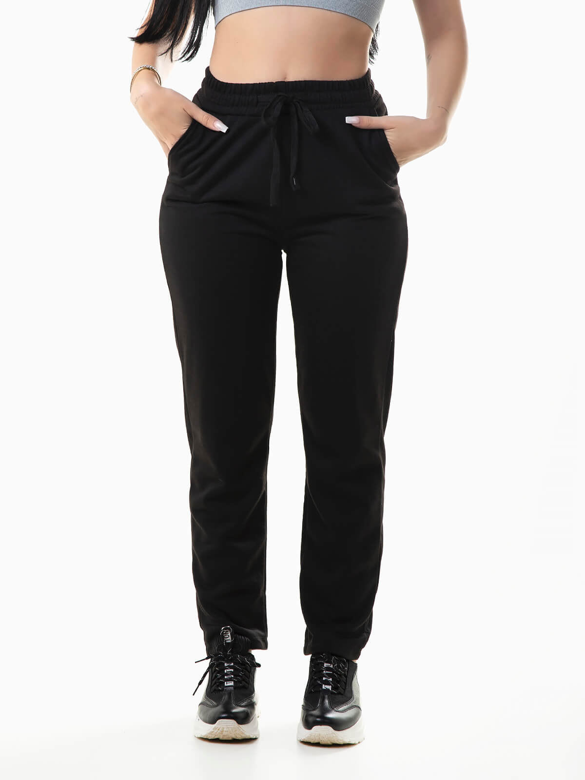 Calças desportivas básicas para senhora. Calças fato treino cintura alta elástica com cordão para ajustar. 2 bolsos.