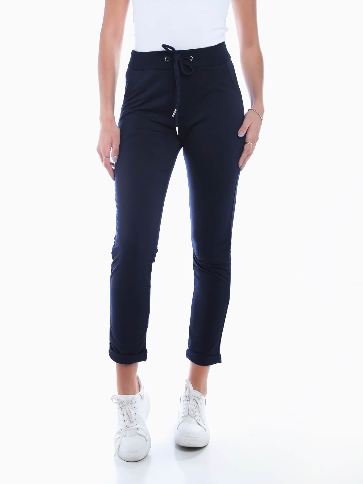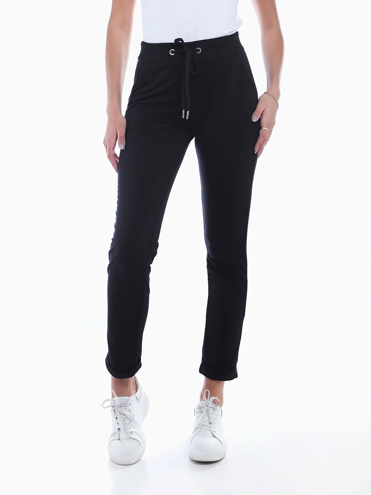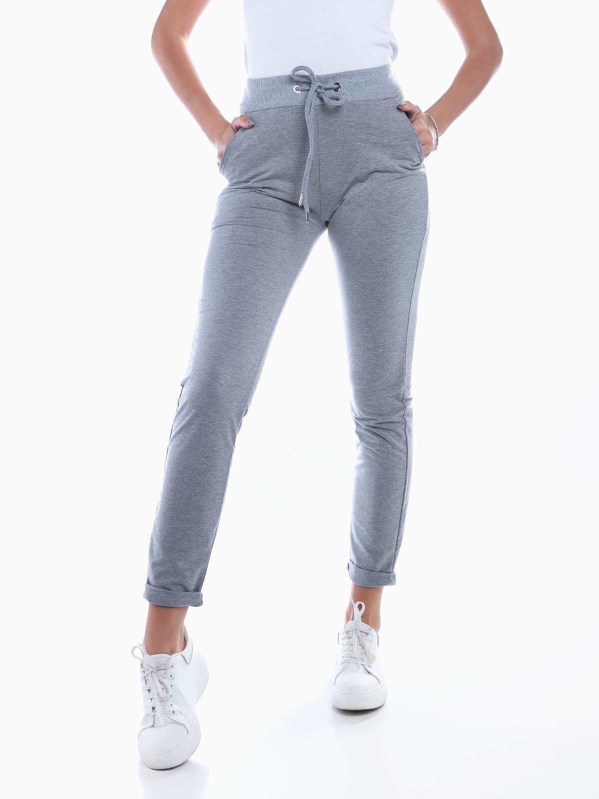 Calças desportivas de cintura alta para senhora. Calças jogger com cordão na cintura para ajustar. 2 bolsos.
