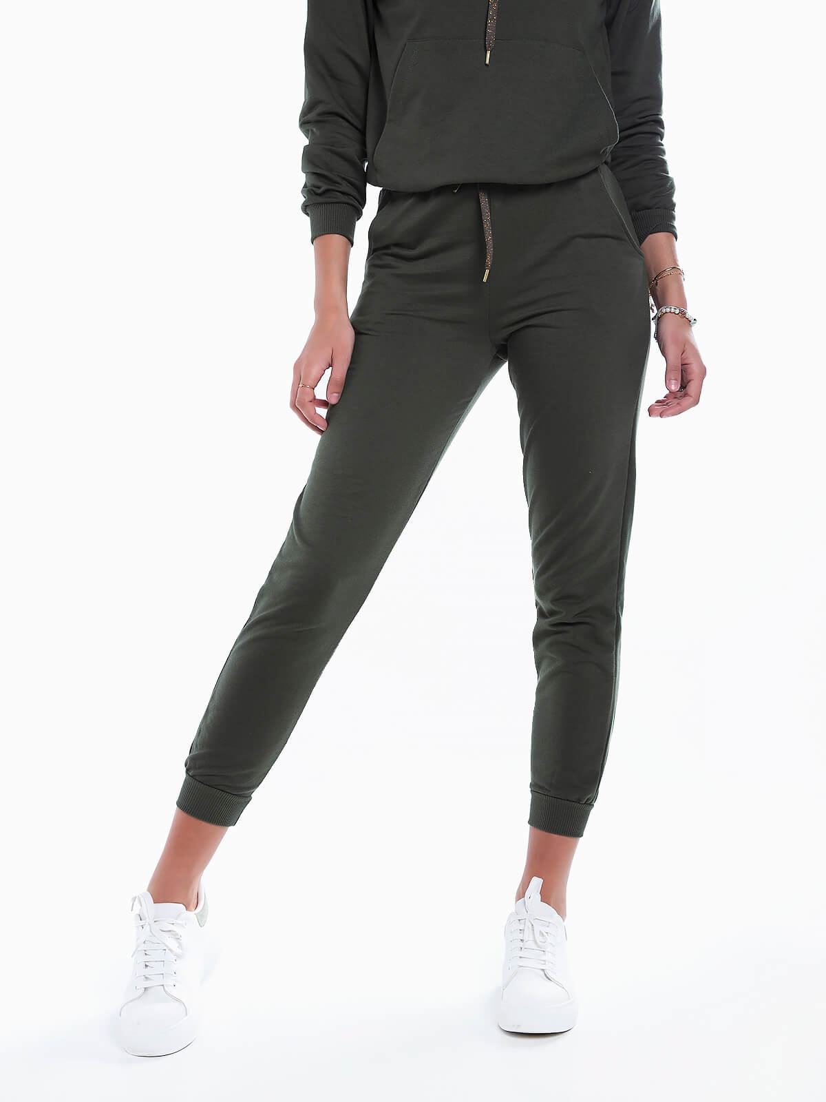 Calças desportivas de cintura alta para senhora. Calças de fato de treino com cordão dourado para ajustar. 2 bolsos. Extremidades elásticas.