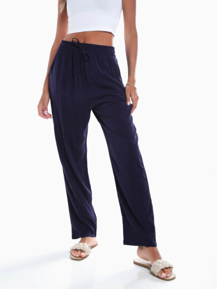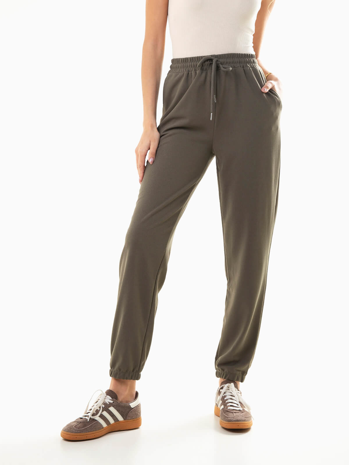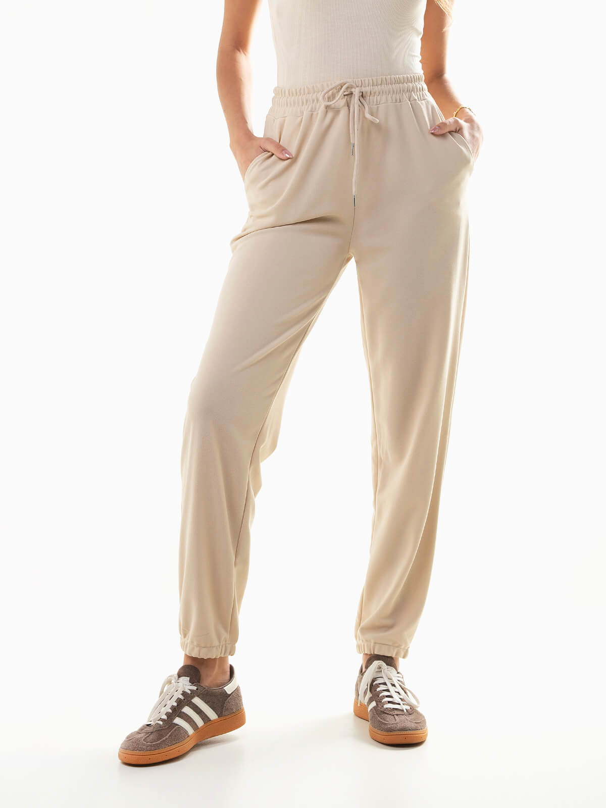 Calças desportivas com cintura alta e punhos elásticos. Calças para senhora com 2 bolsos laterais e cordão para ajustar.