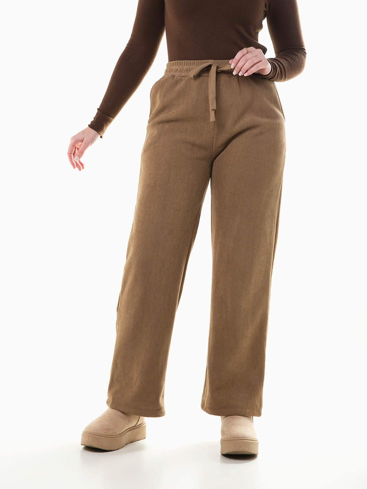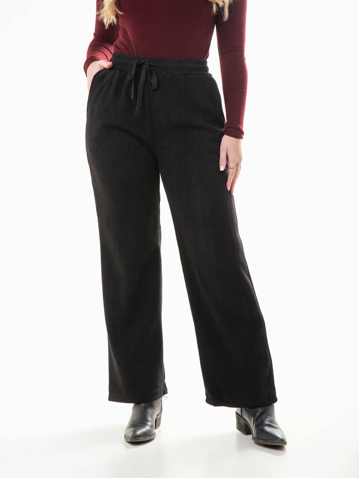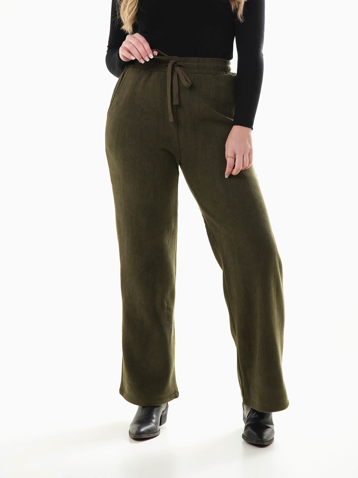 Calças efeito bombazina com cintura alta e cordão para ajustar. Calças largas para mulher com interior cardado e 2 bolsos.