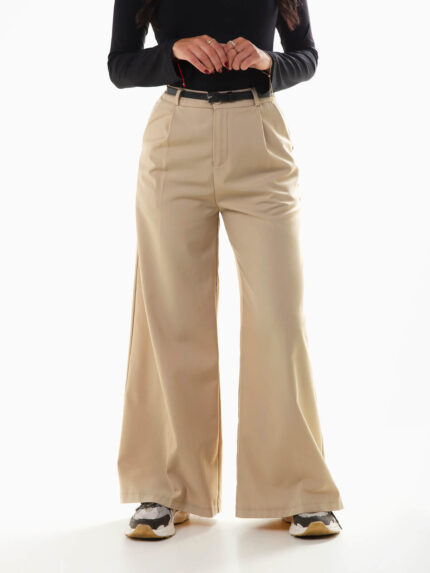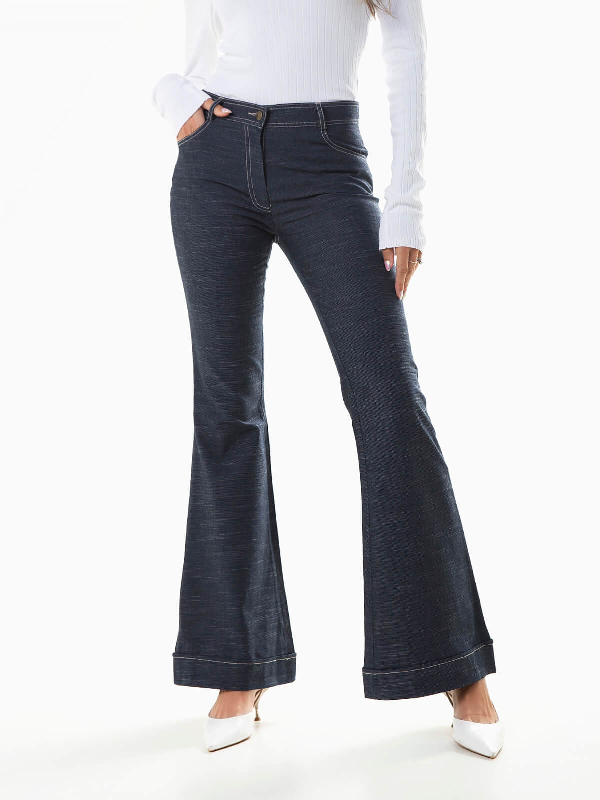 Calças efeito ganga à boca de sino com lavagem azul escuro para senhora. Calças de cintura média com costuras a contrastar. 2 bolsos à frente. Aperto fecho éclair e botão.