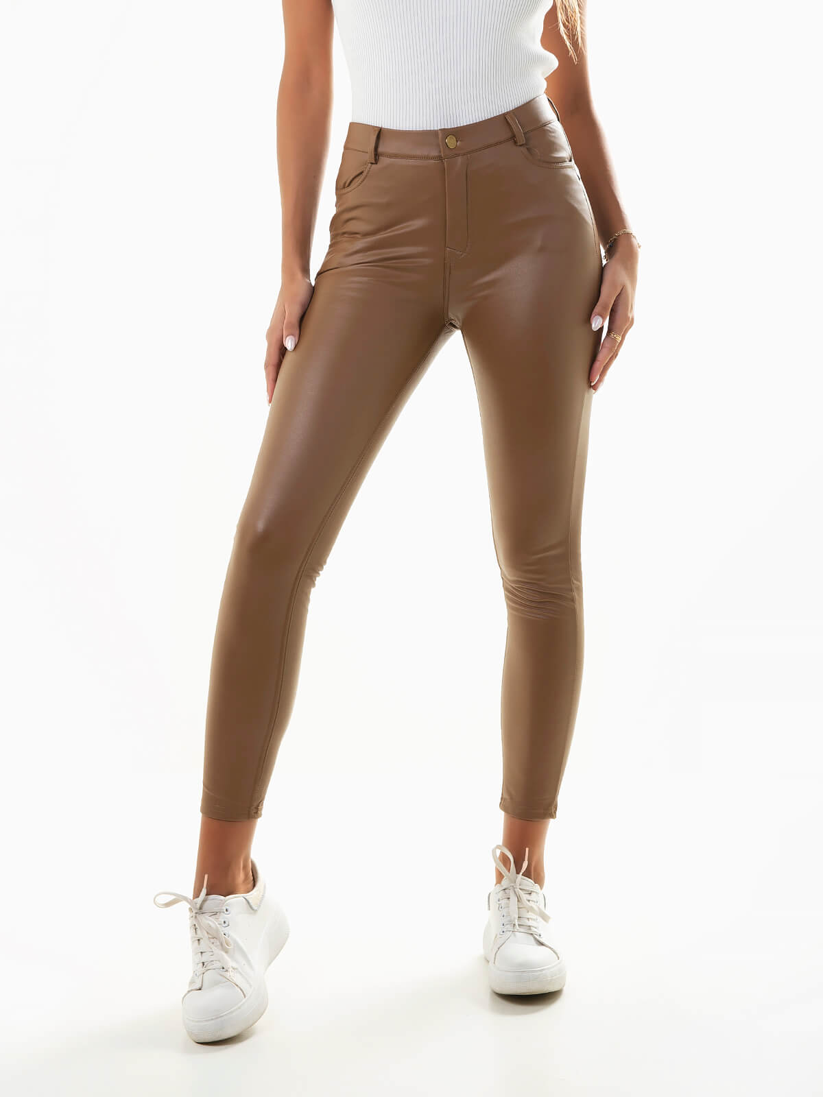 Calças de cintura alta com efeito pele e interior cardado. Calças elásticas para senhora com 4 bolsos. Aperto fecho éclair e botão.