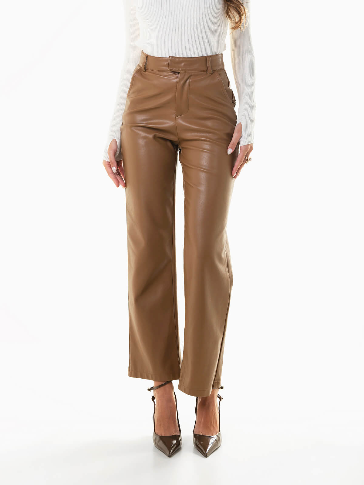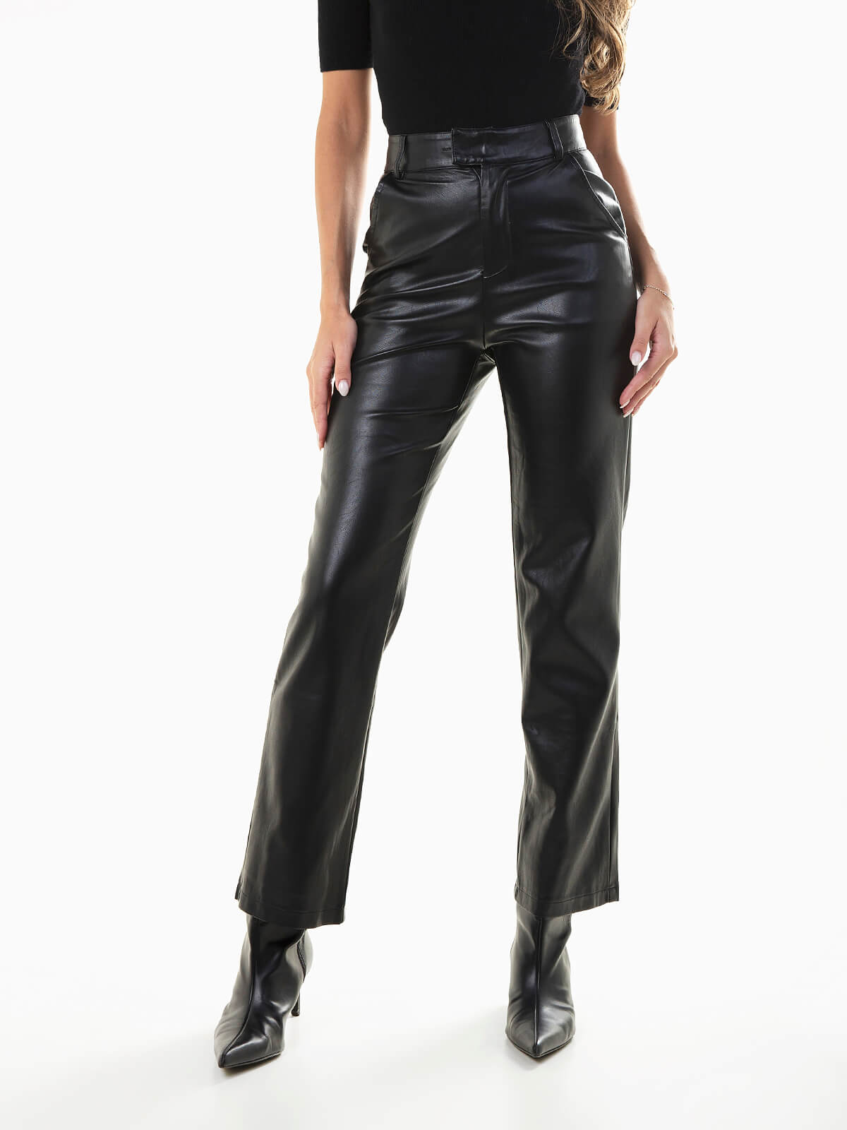 Calças de perna larga em tecido efeito pele, com cintura alta e 4 bolsos. Aperto frontal com fecho éclair e botões. Um modelo moderno e versátil, ideal para looks urbanos e cheios de estilo. Combina com uma camisa fluida e botas altas para um look elegante e atual.