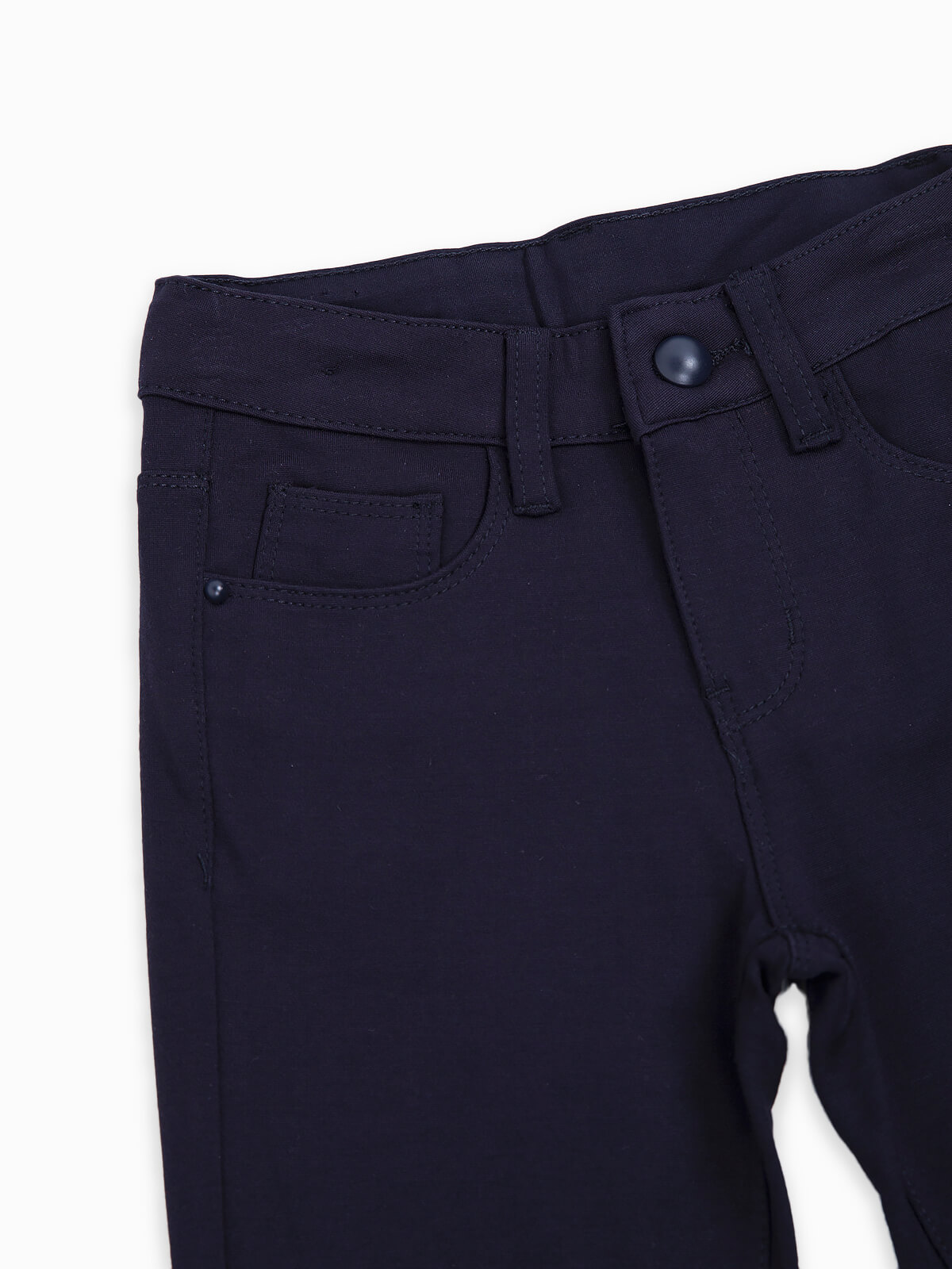 Calças elásticas azul marinho para senhora. Calças skinny de cintura alta. 5 bolsos. Aperto de fecho éclair e botão.