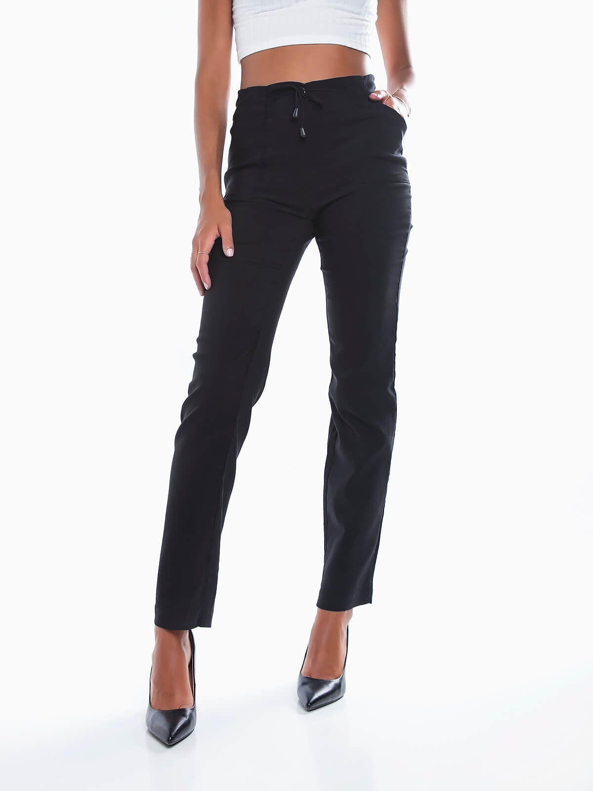 Calças elásticas com bolsos quadrados aplicados na frente. Calças de cintura alta e cordão para ajustar. Perna reta. Aperto de fecho éclair e botão.