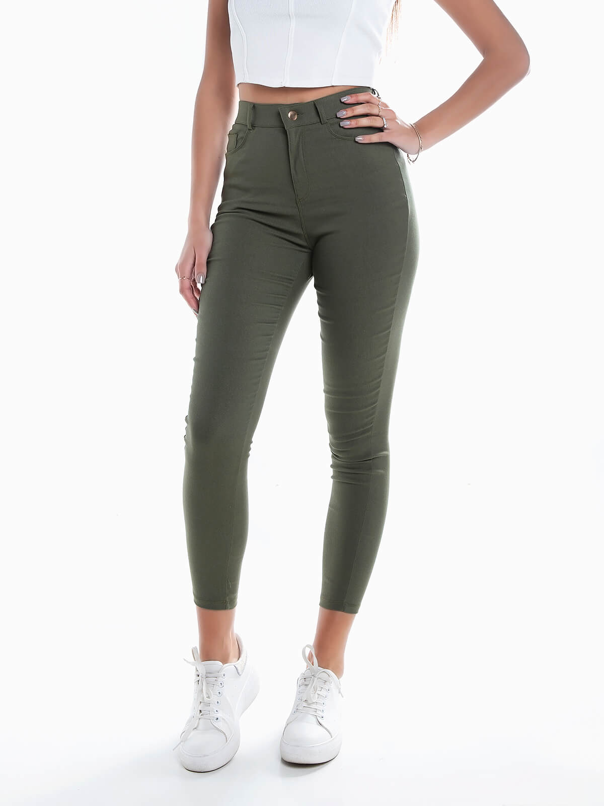 Calças elásticas de cintura alta para senhora. Calças justas com 5 bolsos. Aperto de fecho éclair e botão.