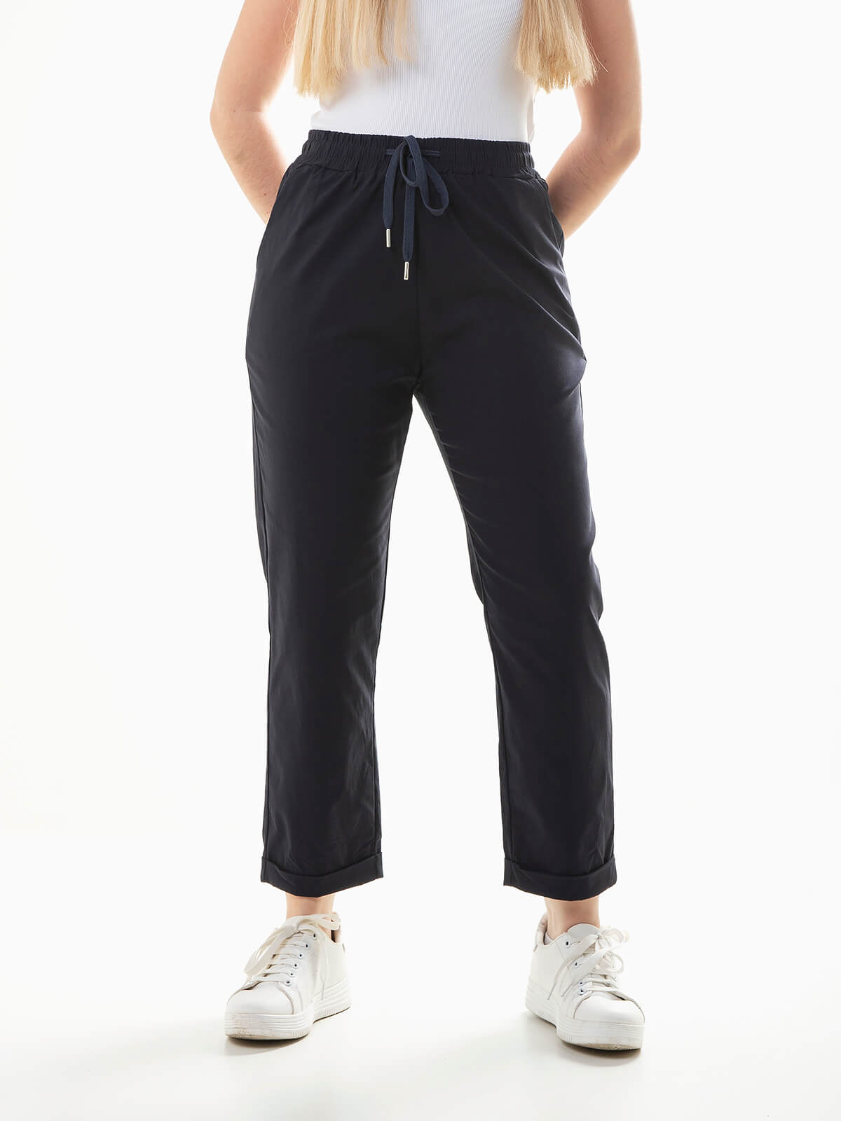 Calças elásticas com dobra nos punhos. Calças de cintura alta com cordão para ajustar. 2 bolsos.